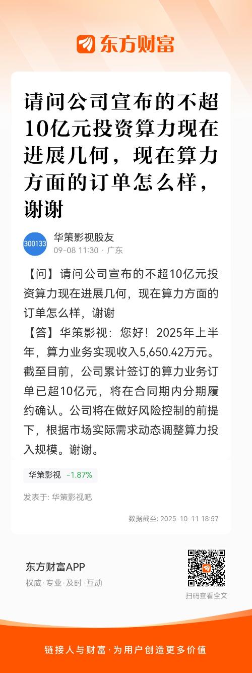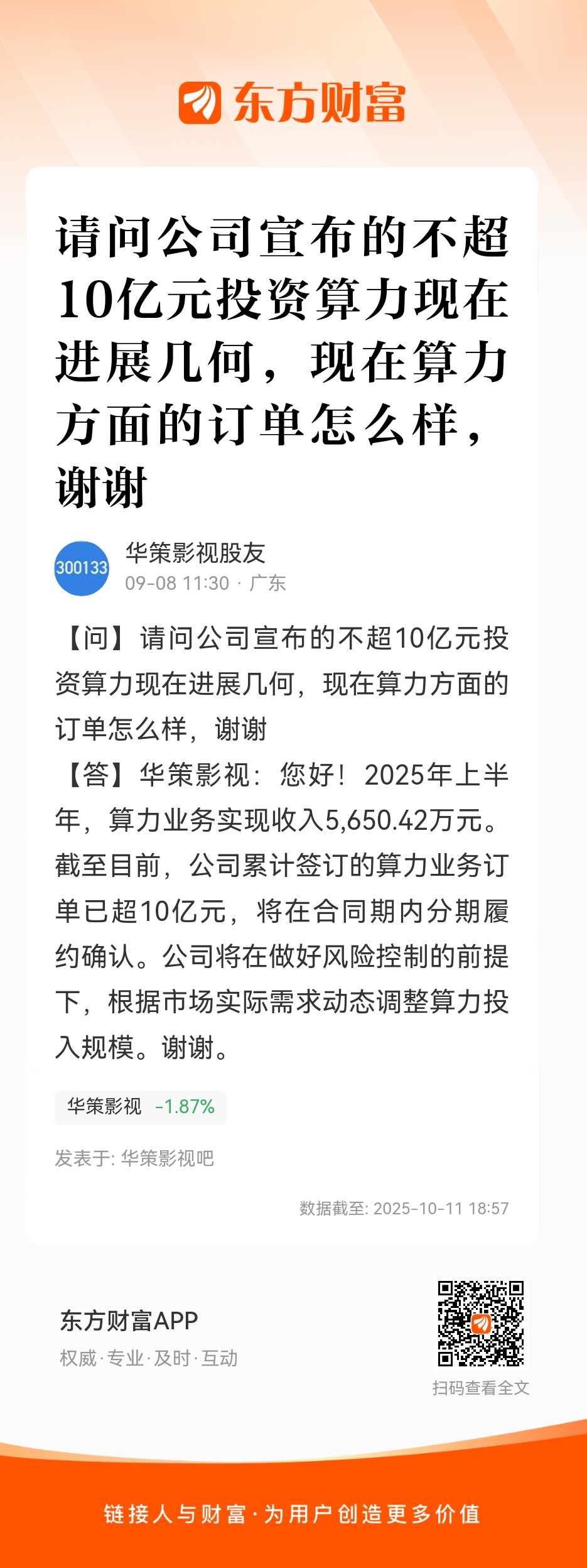 您好!2025年上半年,算力业务实现收入5,650.42万元。截至目前,公司累计签订的算力业务订单已超10亿元,将在合同期内分期履约确认。公司将在做好风险控制的前提下,根据市场实际需求动态调整算力投入规模。谢谢。