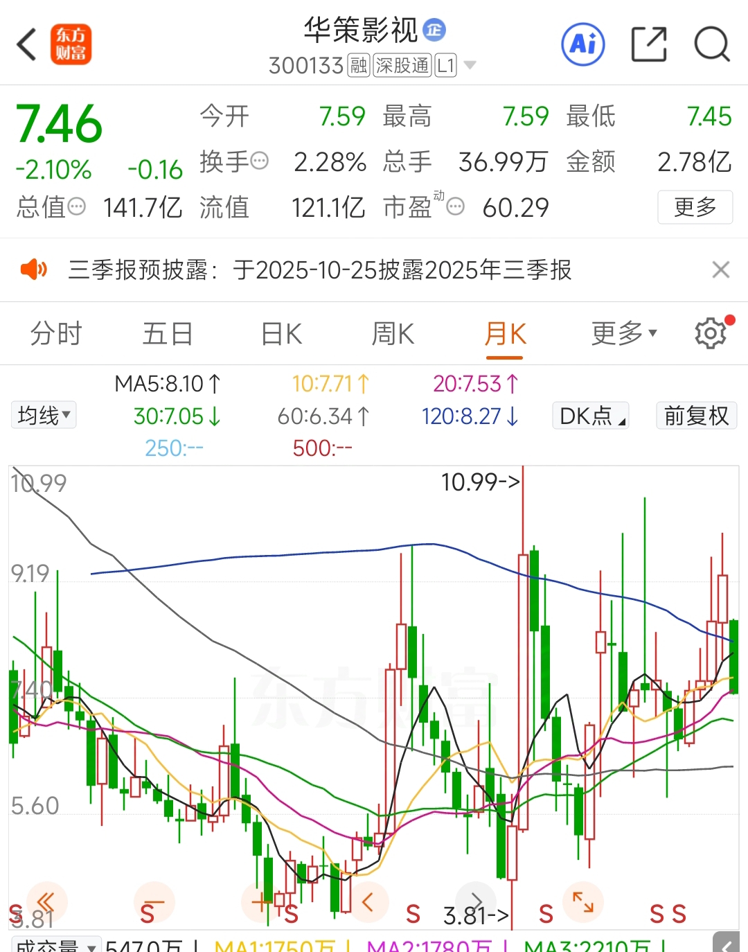 $华策影视(SZ300133)$ 看看月线,砸到5块,你有5块的华策,老傅有5亿现金