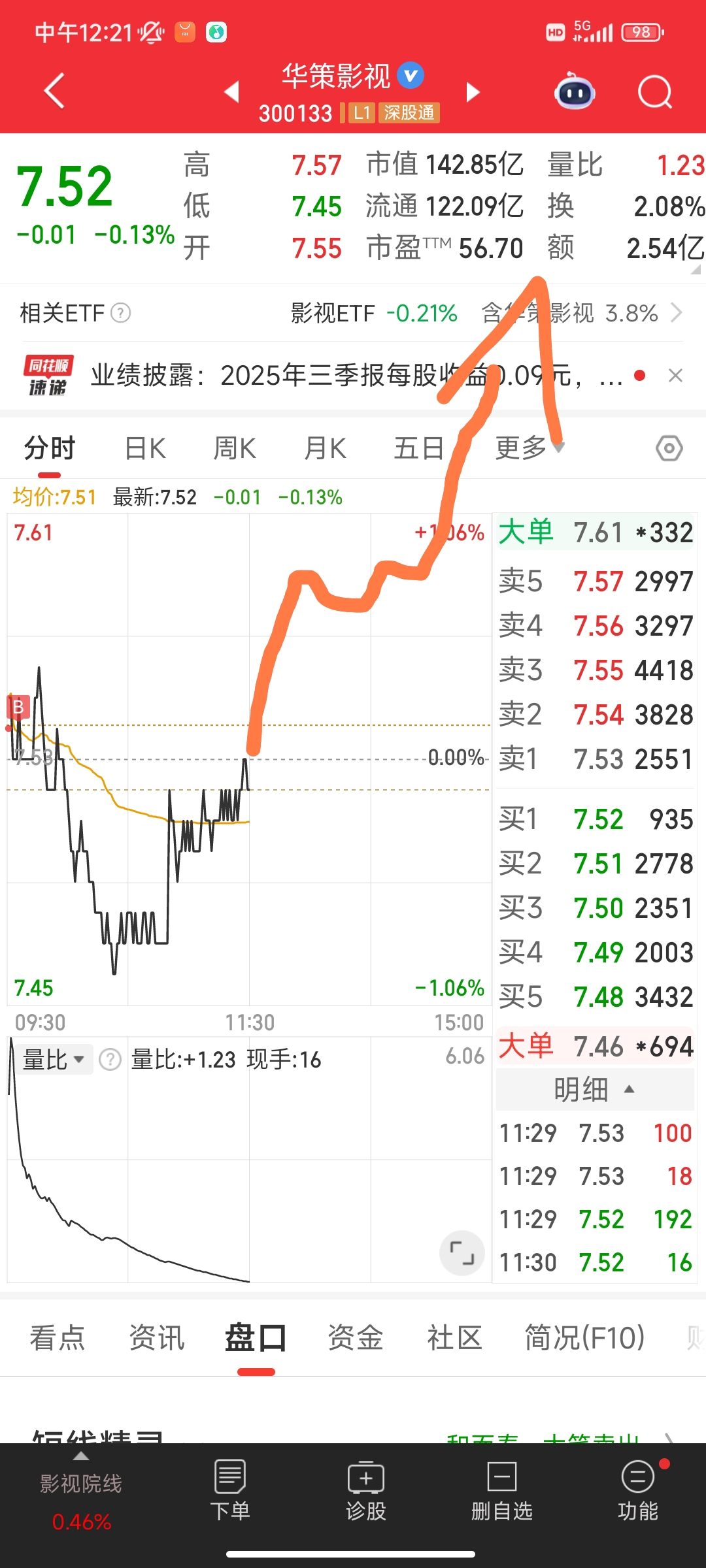 大家好。我是韭哥。我今天又进场了。我确定了影视龙华策即将拉升。我看中的是散户大幅