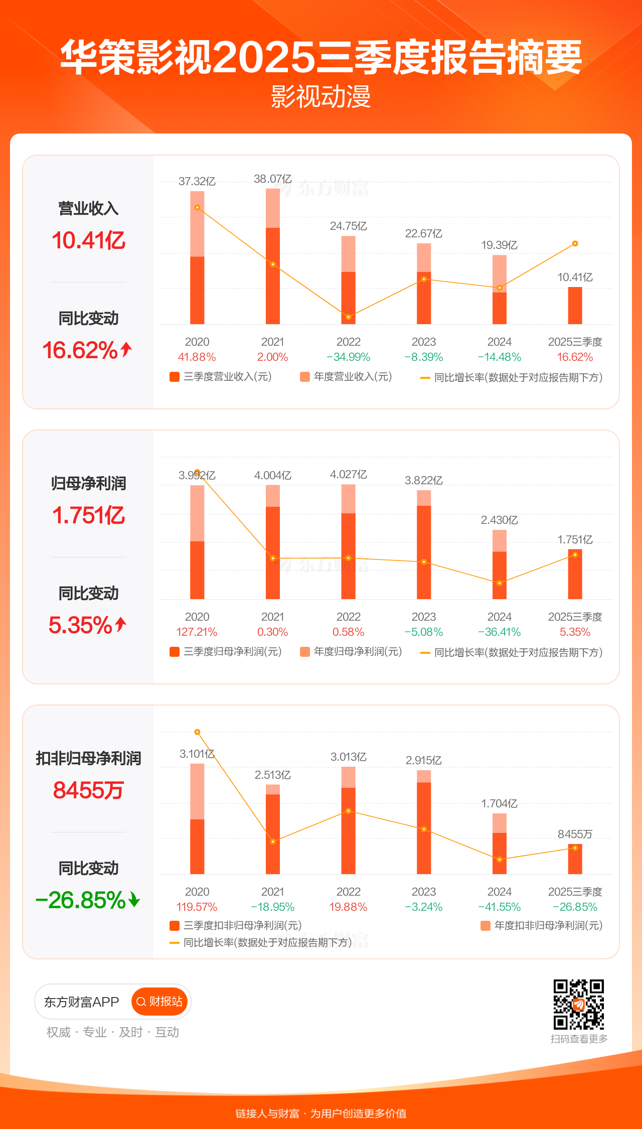华策影视10月25日发布2025年三季报显示,公司前三季实现营业收入10.41亿元,同比增长16.62%;归母净利润1.75亿元,同比增长5.35%;扣非归母净利润8455.00万元,同比下滑26.85%。