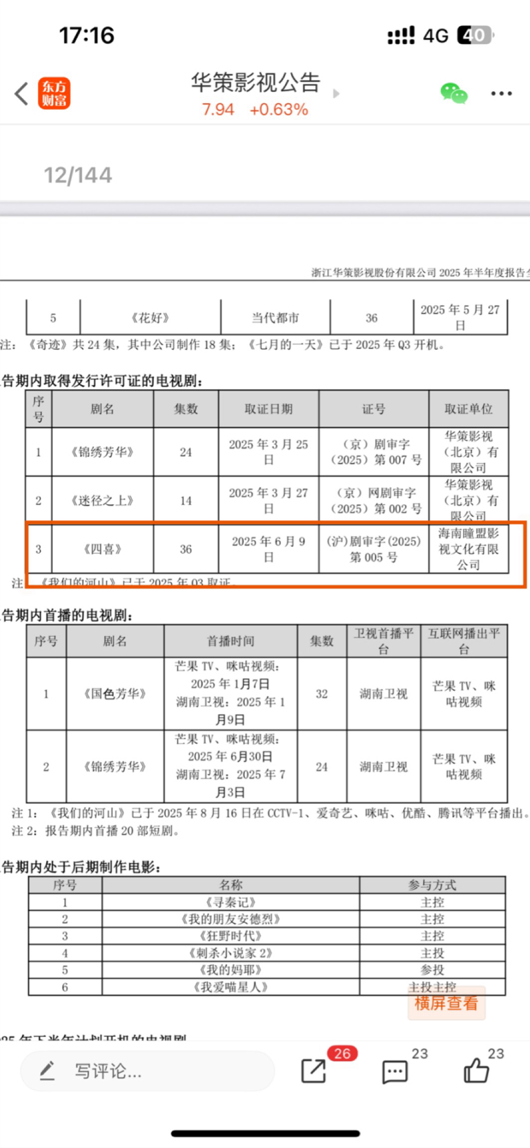 $华策影视(SZ300133)$ 四喜是华策发行的啊,半年报里有详细说明哈