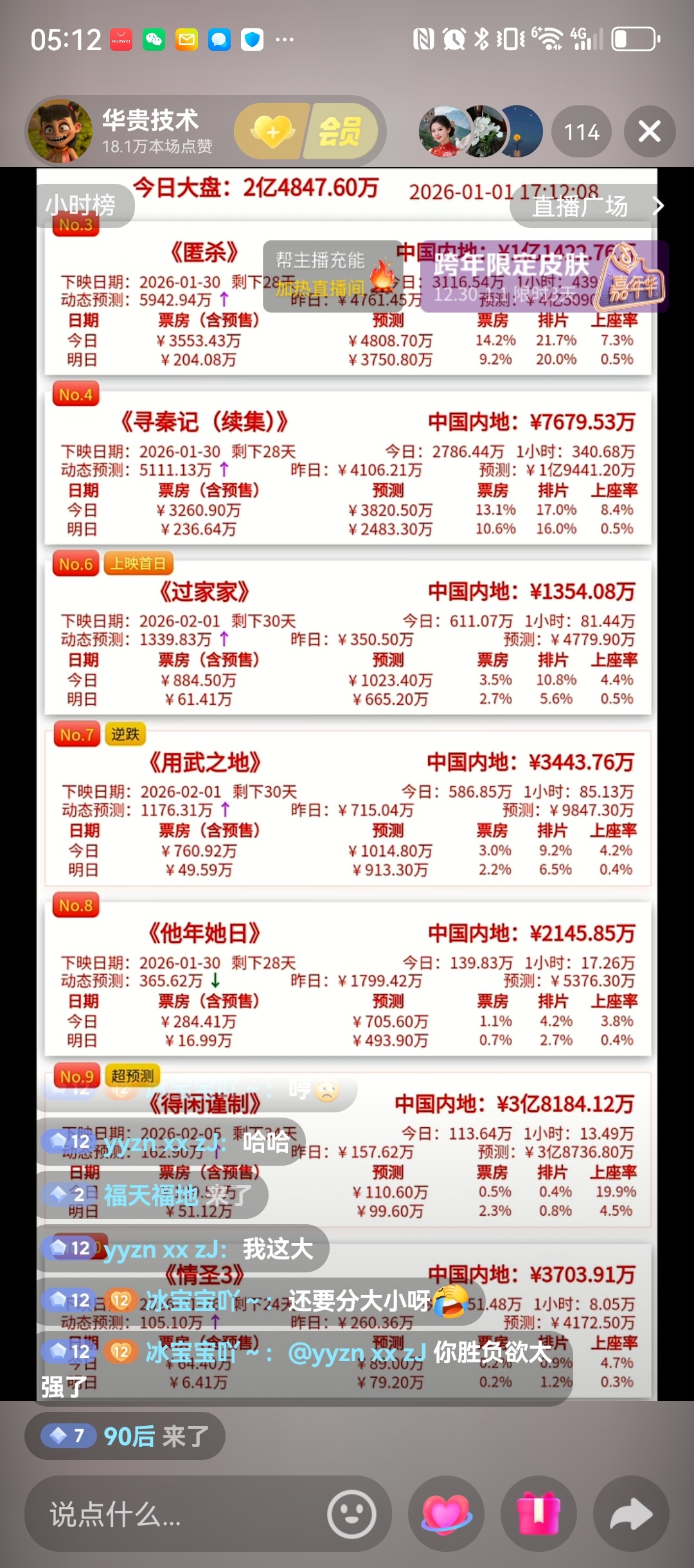 想知道实时票房的,可以搜索一下这个人,他一直直播的。实时数据。看不下去几个空苟一直叫唤!
