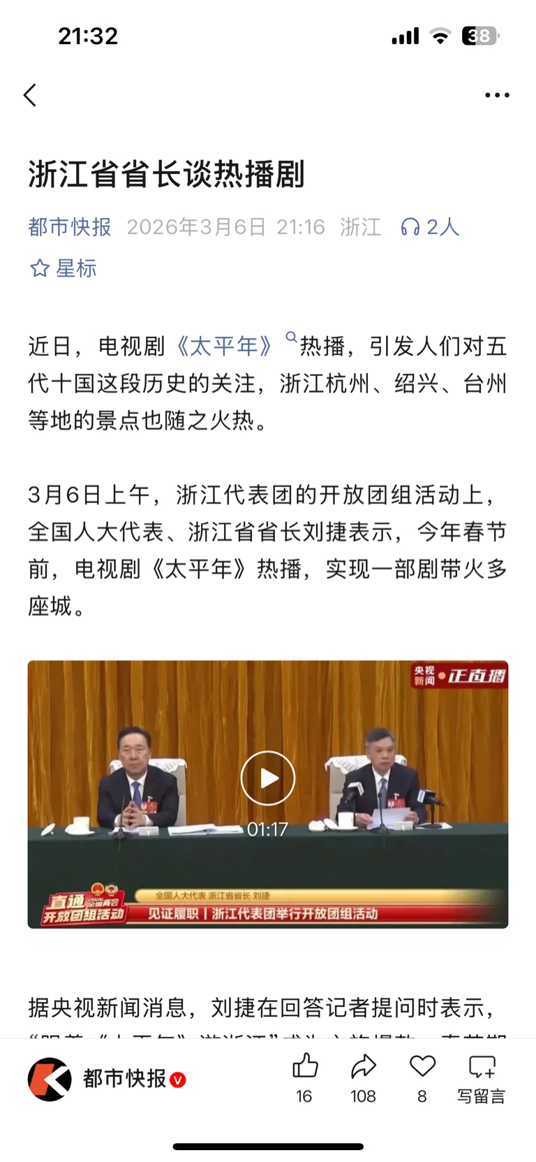 $华策影视(SZ300133)$ 浙江省长在两会点赞太《太平年》