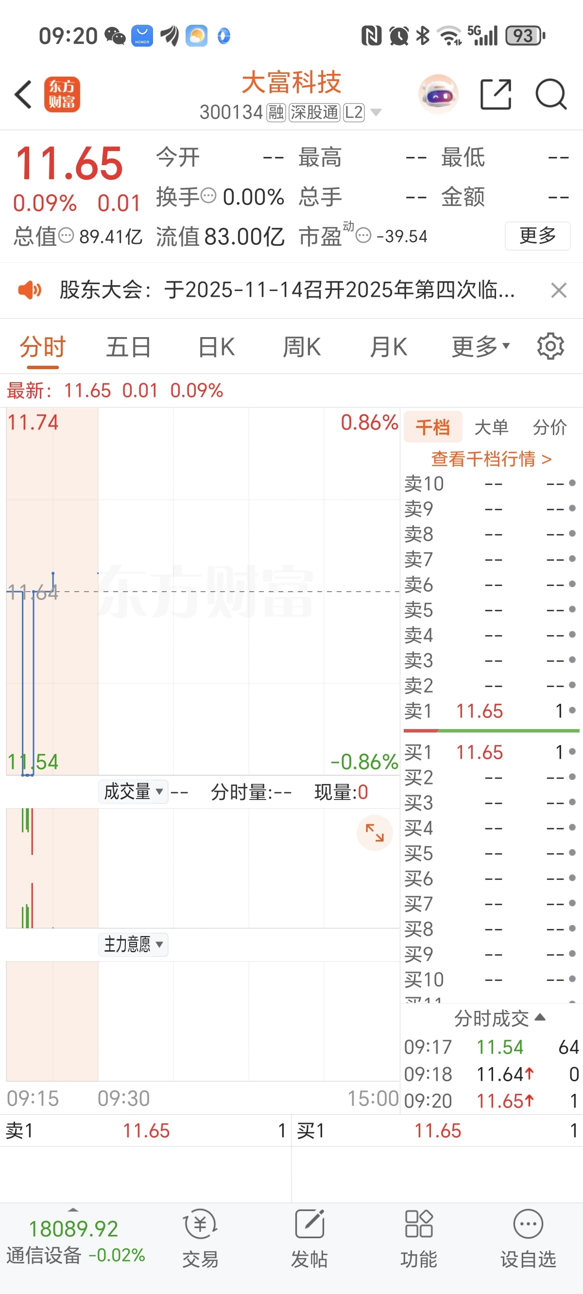$大富科技(SZ300134)$ 9点20 竞价才1手?