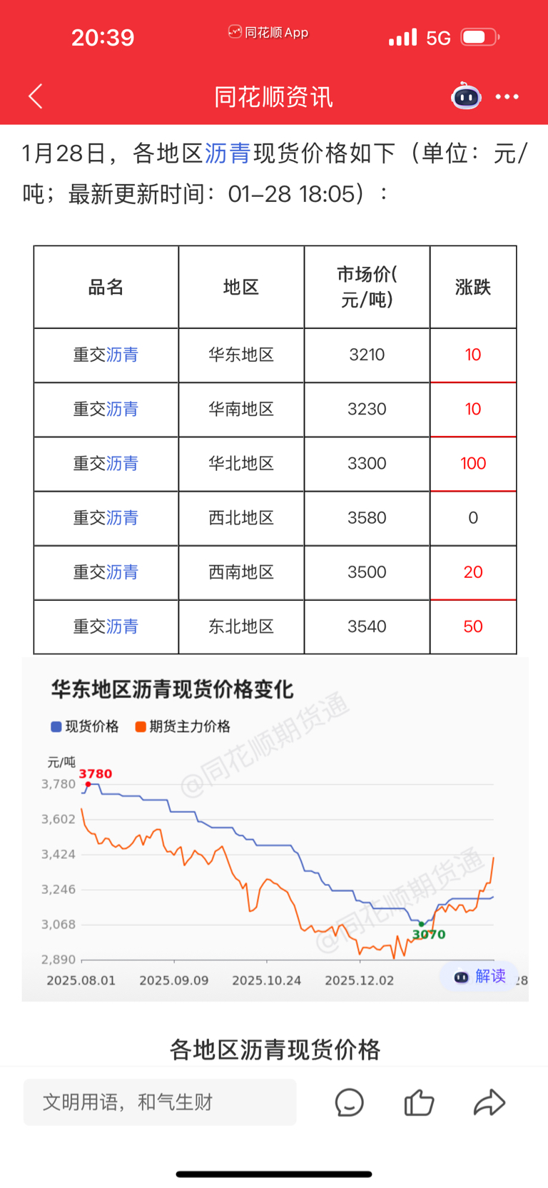 $宝利国际(SZ300135)$ 大冬天居然东北沥青都在涨价,看来原油对沥青价格是有影响的。