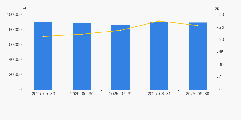 截至2025年9月30日,公司最新总股本为9.68亿股,其中流通股本为8.25亿股。户均持有流通股数量由上期的9108股上升至9180股,户均流通市值23.68万元。