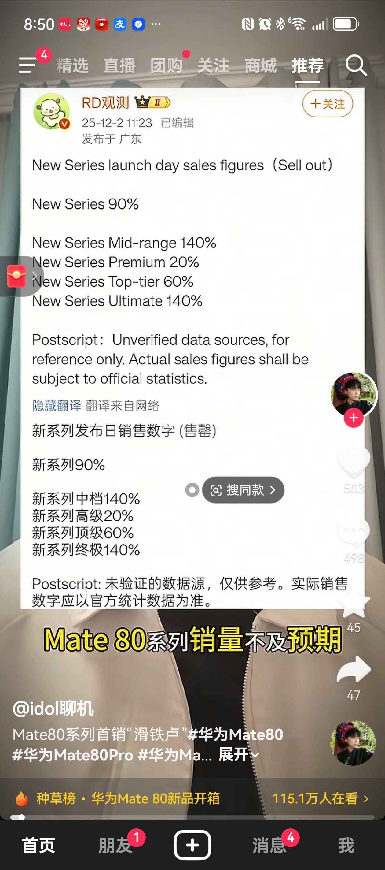 完蛋了,最新消息,mete80销量不及预期,是70全周期也就是900万台,而其中