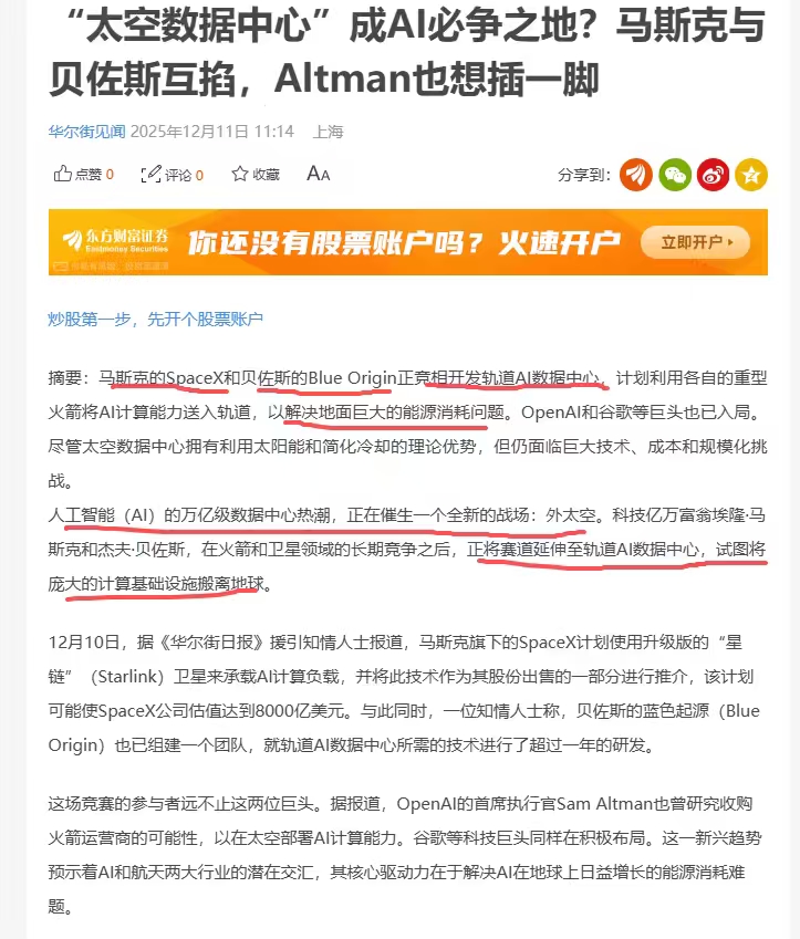 $信维通信(SZ300136)$ $航宇微(SZ300053)$ “太空数据中心”成AI必争之地?马斯克与贝佐斯互掐,Altman也想插一脚