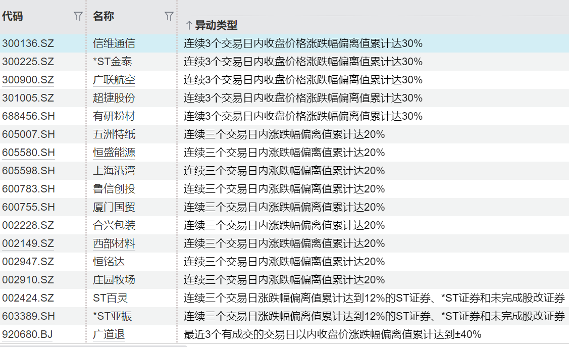 信维通信、*ST金泰、广联航空等连续三个交易日内涨跌幅偏离值累计达30%。