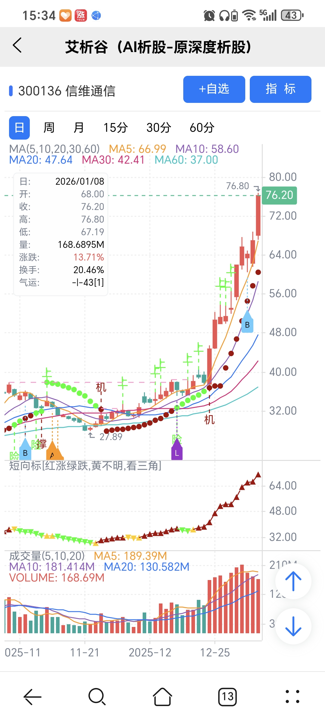 机会:股价上穿艾短波或绿变红、红字;