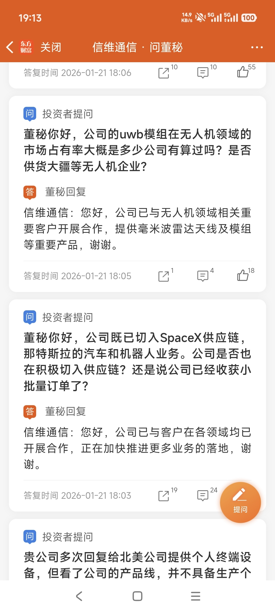 问题中提及SpaceX,tsl,董秘回应已与客户。