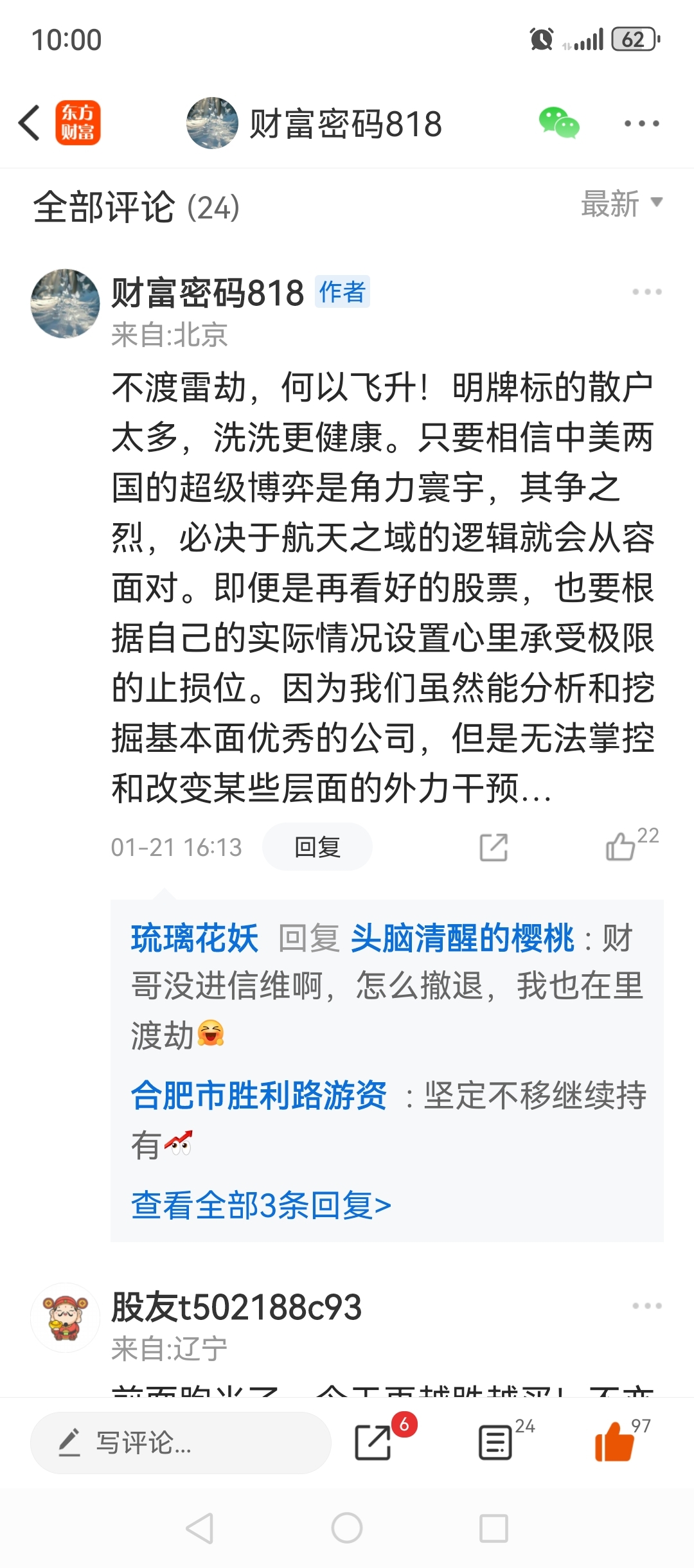 温馨提示: 1.根据《证券法》规定,禁止编造、传播虚假信息或者误导性信息,扰乱证券市场;2.用户在本社区发表的所有资料、言论等仅代表个人观点,与本网站立场无关,不对您构成任何投资建议。用户应基于自己的独立判断,自行决定证券投资并承担相应风险。《东方财富社区管理规定》