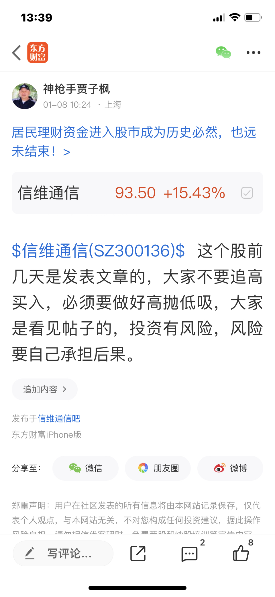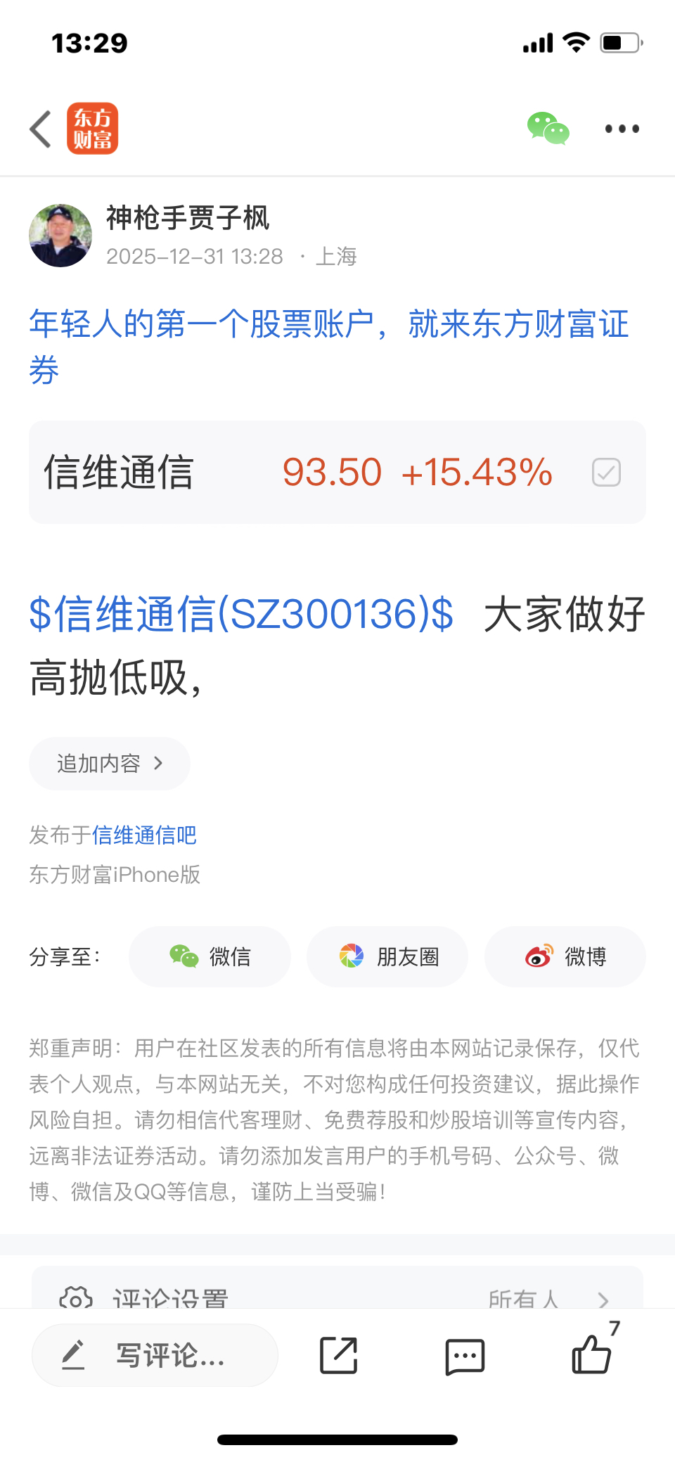 $信维通信(SZ300136)$ 这个股我是12月31号发表文章看涨的股票,大家不要追高买入,必须要做好高抛低吸,我是不推荐股票的,大家不要跟我买卖股票,大家自己买什么样的股票是和我无关的,因为我是免费和大家一起交流股票,我是和大家一起学习的,我的观点仅供参考,不构成任何投资建议,投资有风险,风险要自己承担后果,