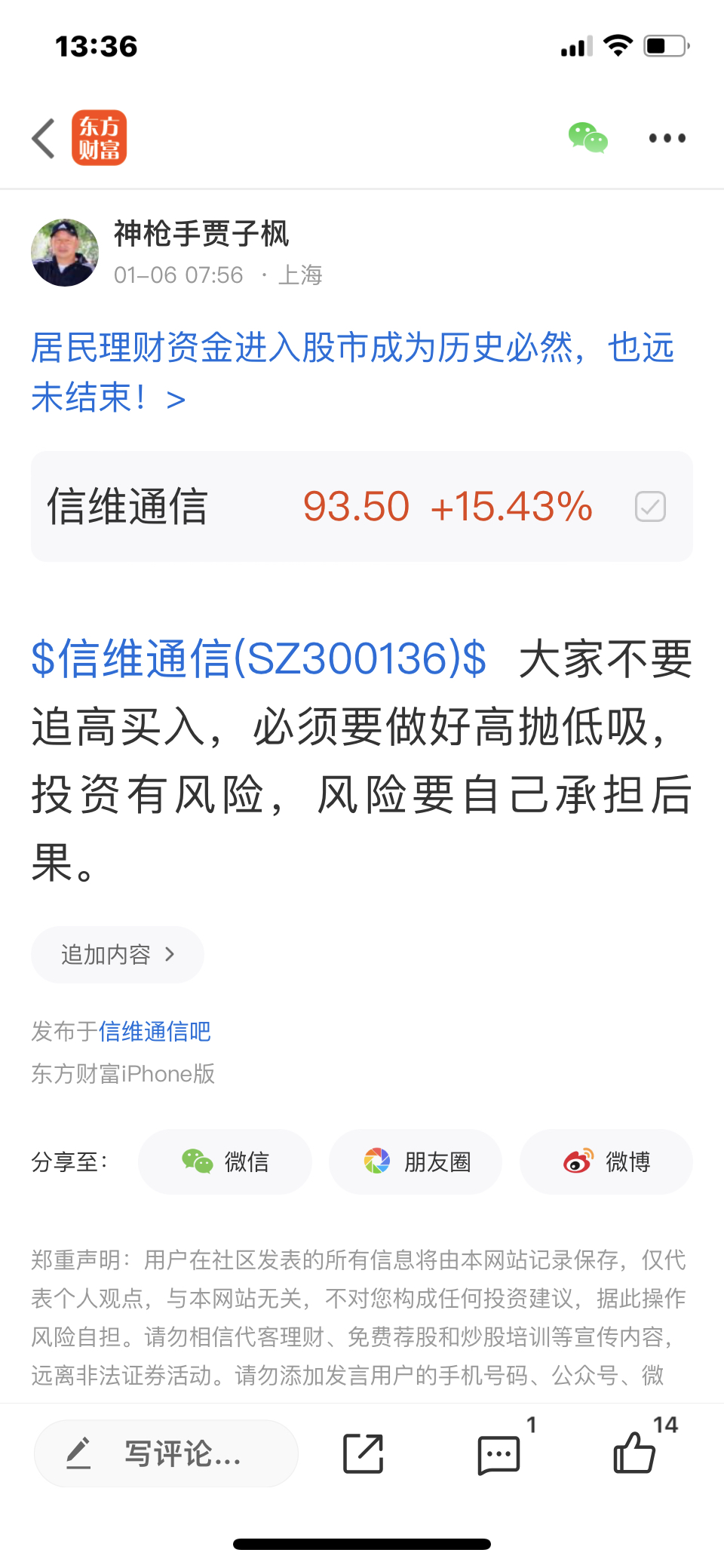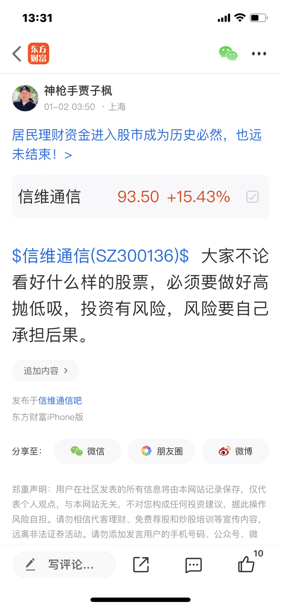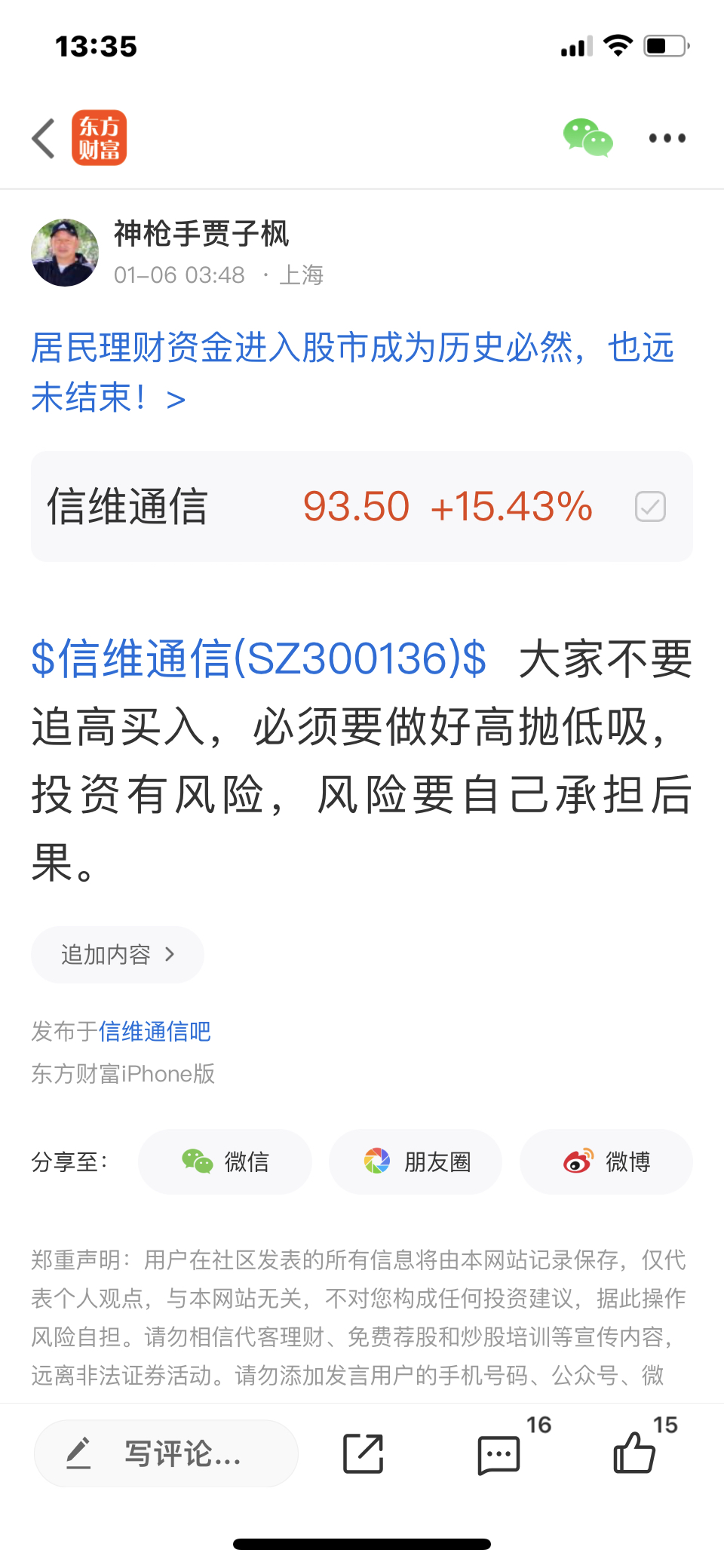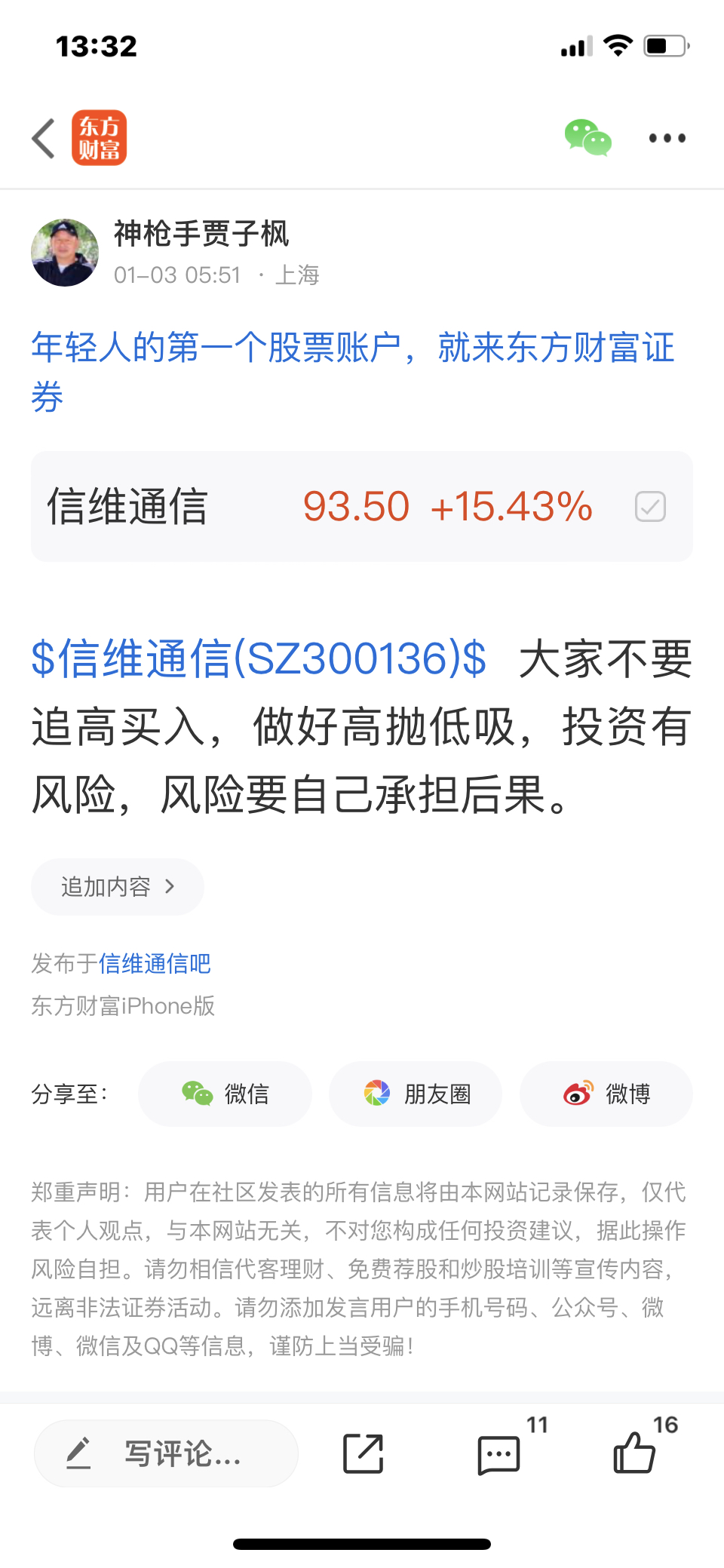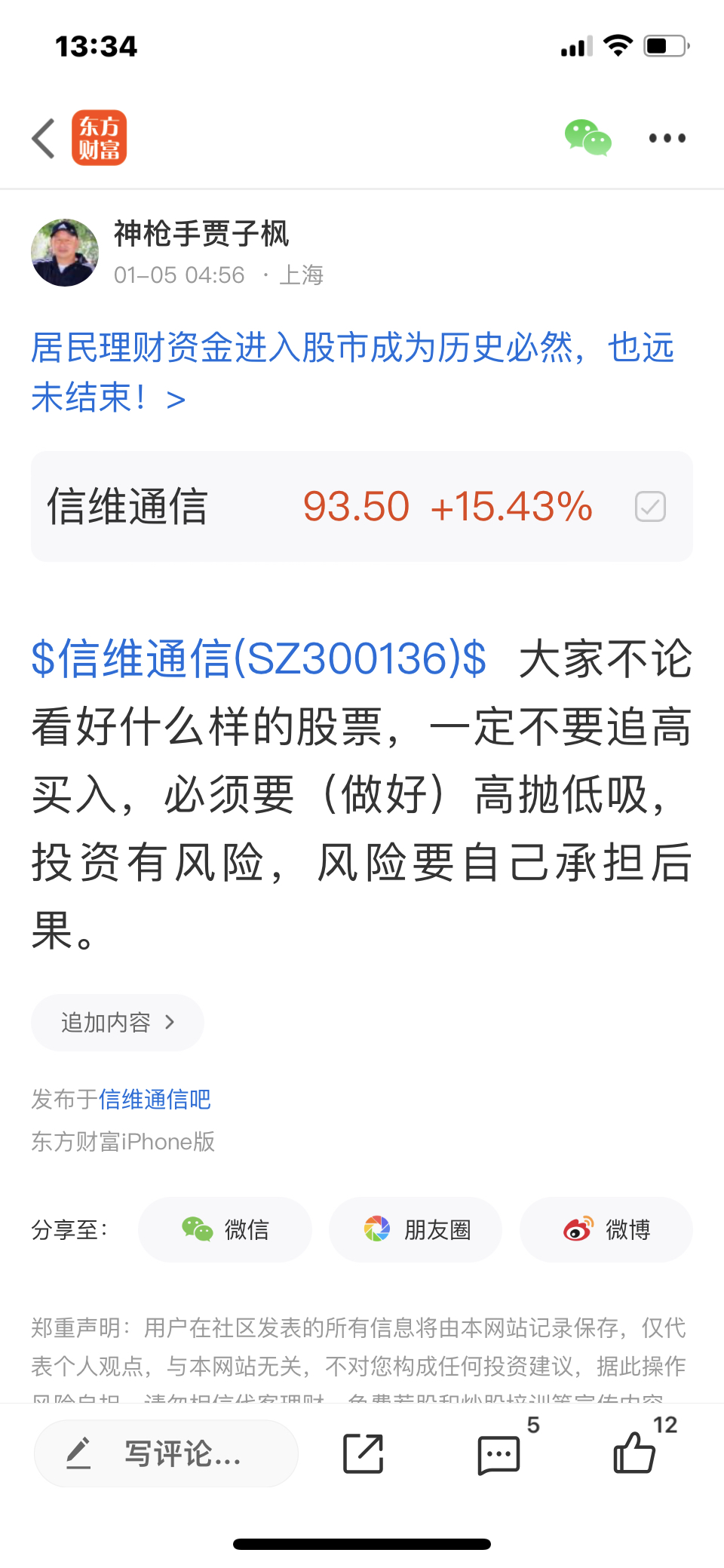 $信维通信(SZ300136)$ 这个股我是12月31号发表文章看涨的股票,大家不要追高买入,必须要做好高抛低吸,我是不推荐股票的,大家不要跟我买卖股票,大家自己买什么样的股票是和我无关的,因为我是免费和大家一起交流股票,我是和大家一起学习的,我的观点仅供参考,不构成任何投资建议,投资有风险,风险要自己承担后果,