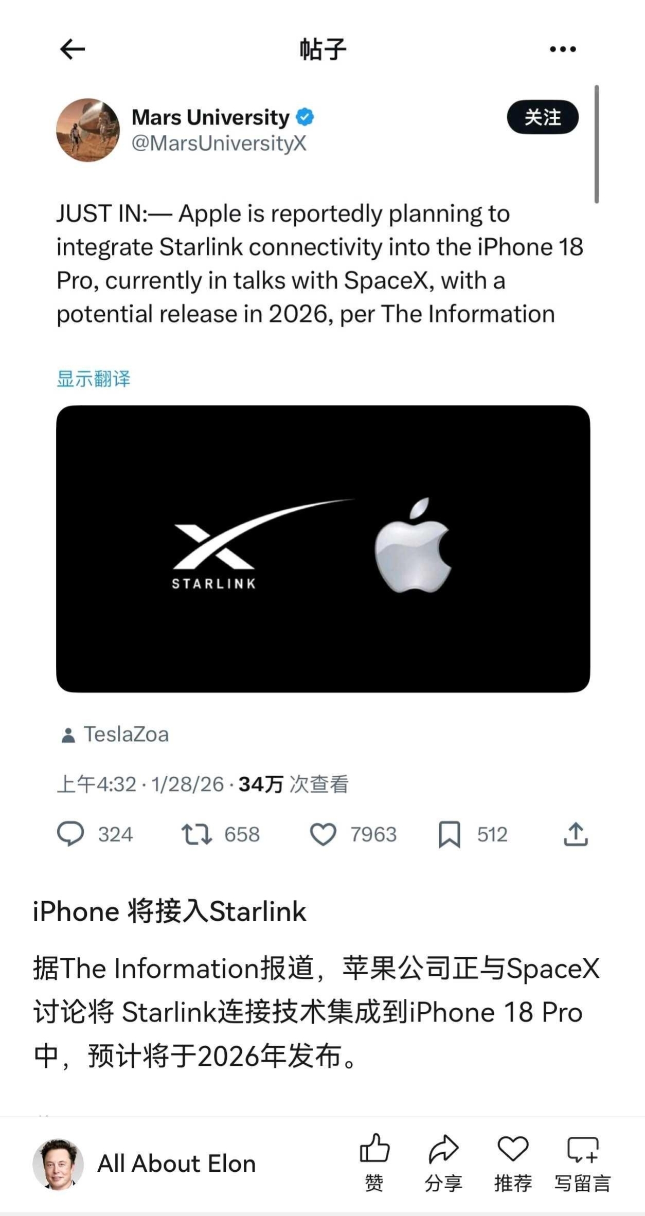 据《TheInformation》报道,苹果正与SpaceX进行谈判,计划将星链