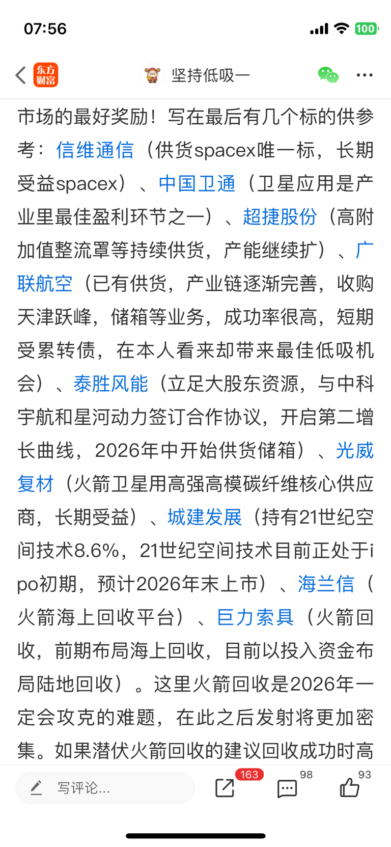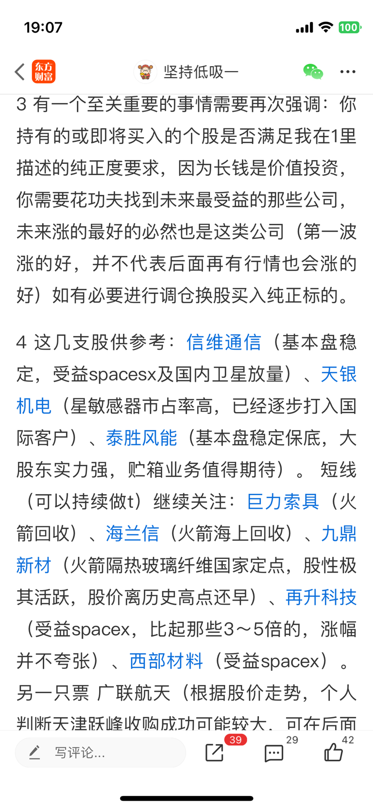 写在最后,照例给出短期建议,由于我们落后spacex8~10年,在火箭回收技术成熟掌握前,大规模发送卫星不现实,短期给出建议是紧跟spacex步伐,远离击鼓传花。 spacex产业链:西部材料、信维通信、再升科技、迈为股份;国内火箭回收产业链(国内完成首次回收前短线只推荐火箭回收链):海兰信、巨力索具,长线关注国内星敏感器寡头:天银机电。再次强调 所有推荐只建议逢低位买,比如天银机电,最好等到它下跌一段时间成交量持续大幅萎缩,股价连续三天不再新低时适量介入。