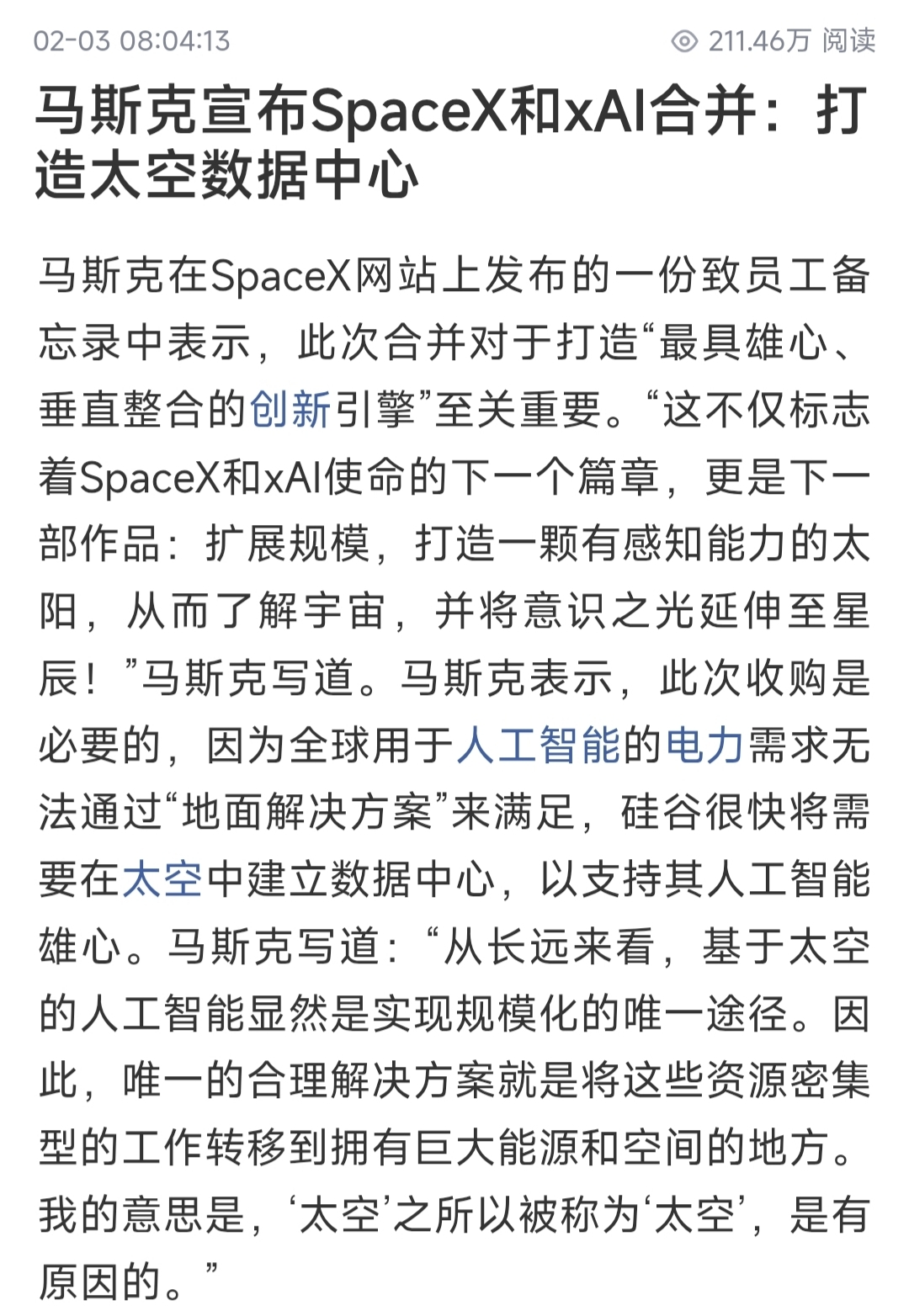 $同有科技(SZ300302)$ 马斯克宣布SpaceX和xAI合并:打造太空数据中心。