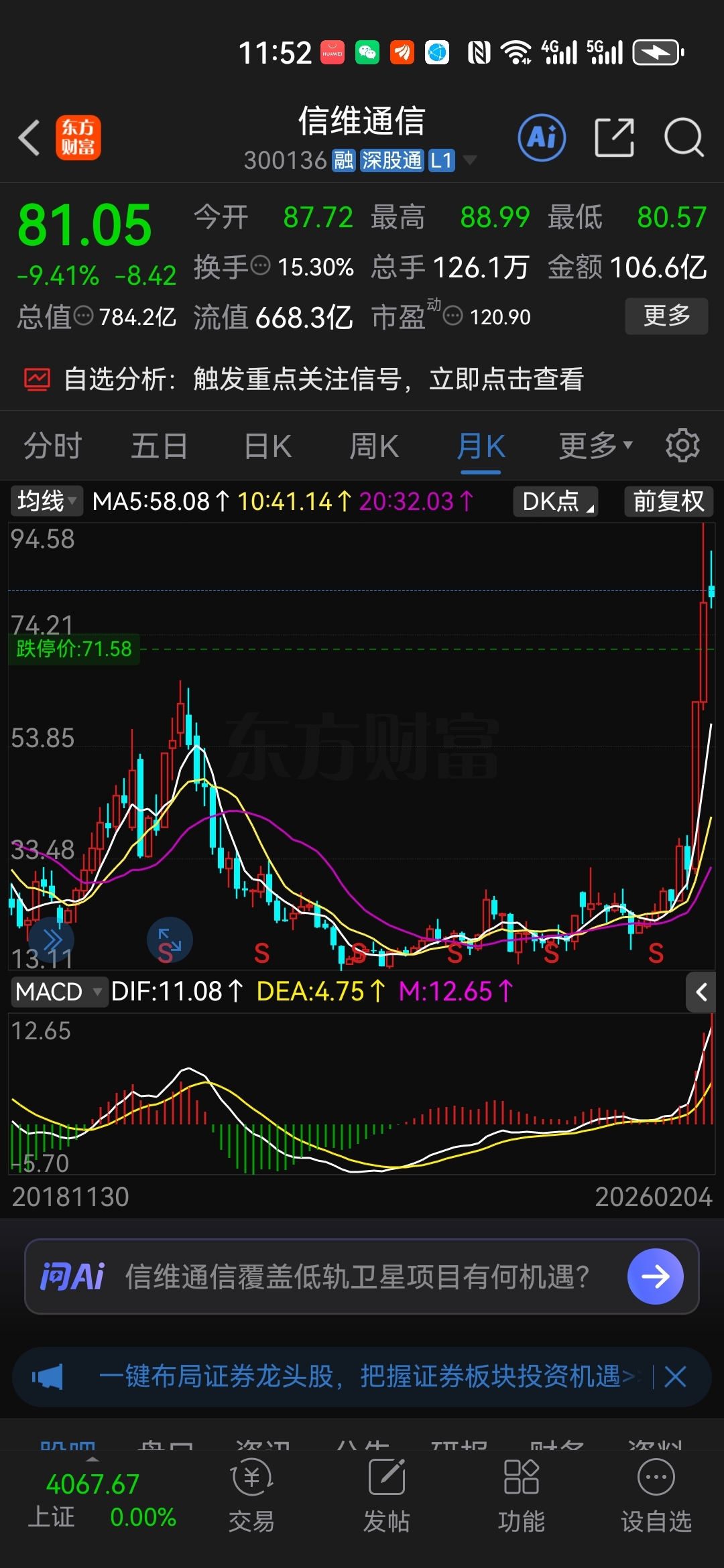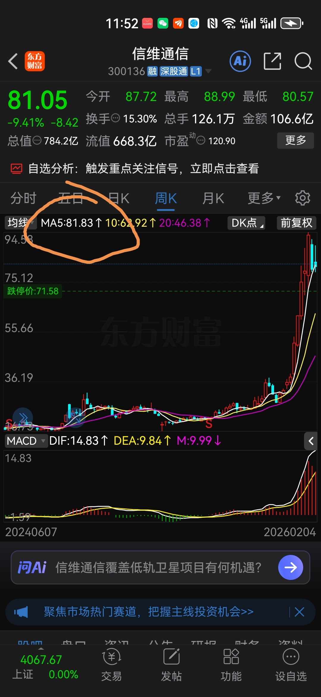 $信维通信(SZ300136)$ 今日任何价位进货的肯定被埋。现在走大周期周线破位下跌(周线5日支撑81.83)明显破位下行。