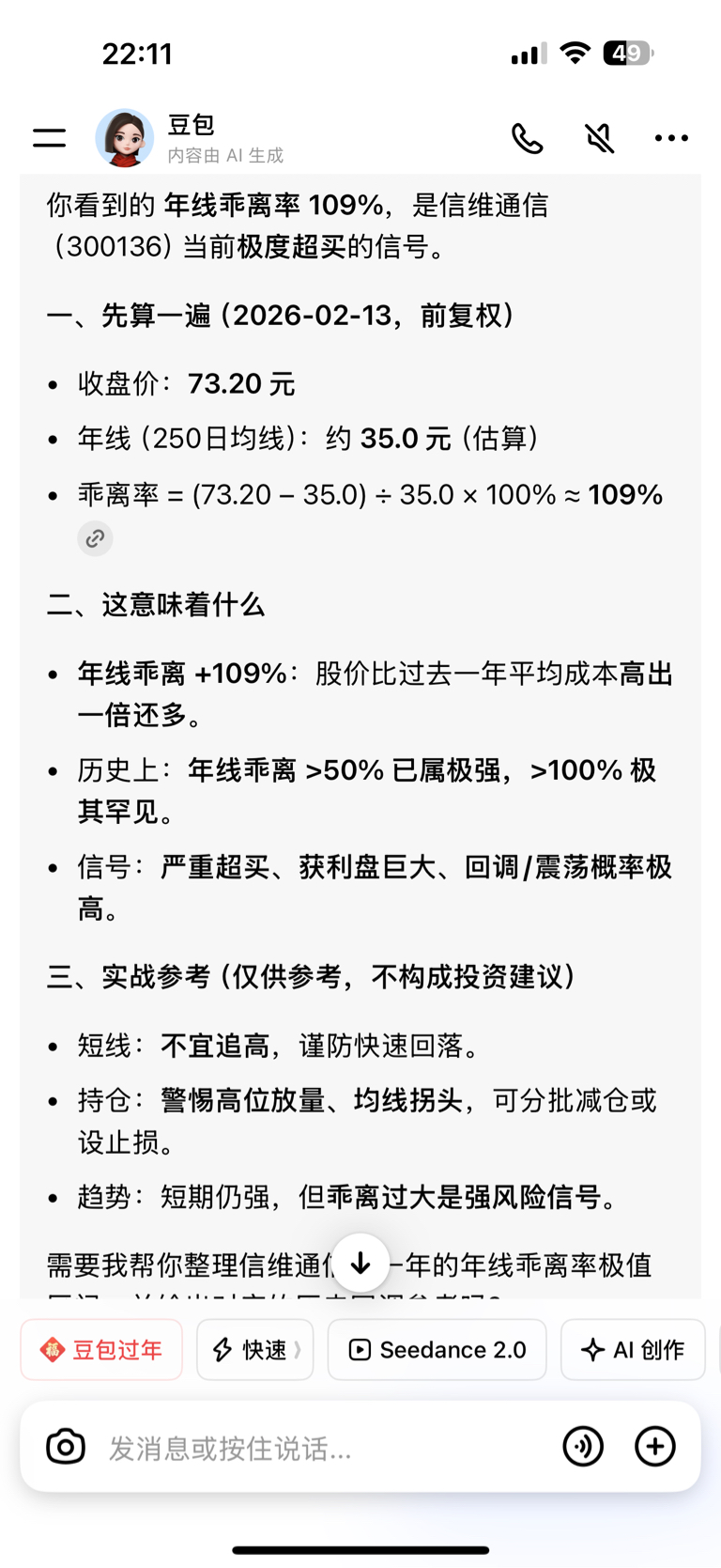 信维乖离率109,乖离率就像拉伸的橡皮筋,109基本上拉伸到极致了,不反弹没事,反弹的话力度会很大,乖离率迟早会反弹的,所以,确定目前信维是上升趋势或者震荡趋势都没问题,随便买,不放心或者认为是破位下跌趋势的就慎重,可等调整好再低价买,109的乖离率 跌起来空间会大到你不敢想