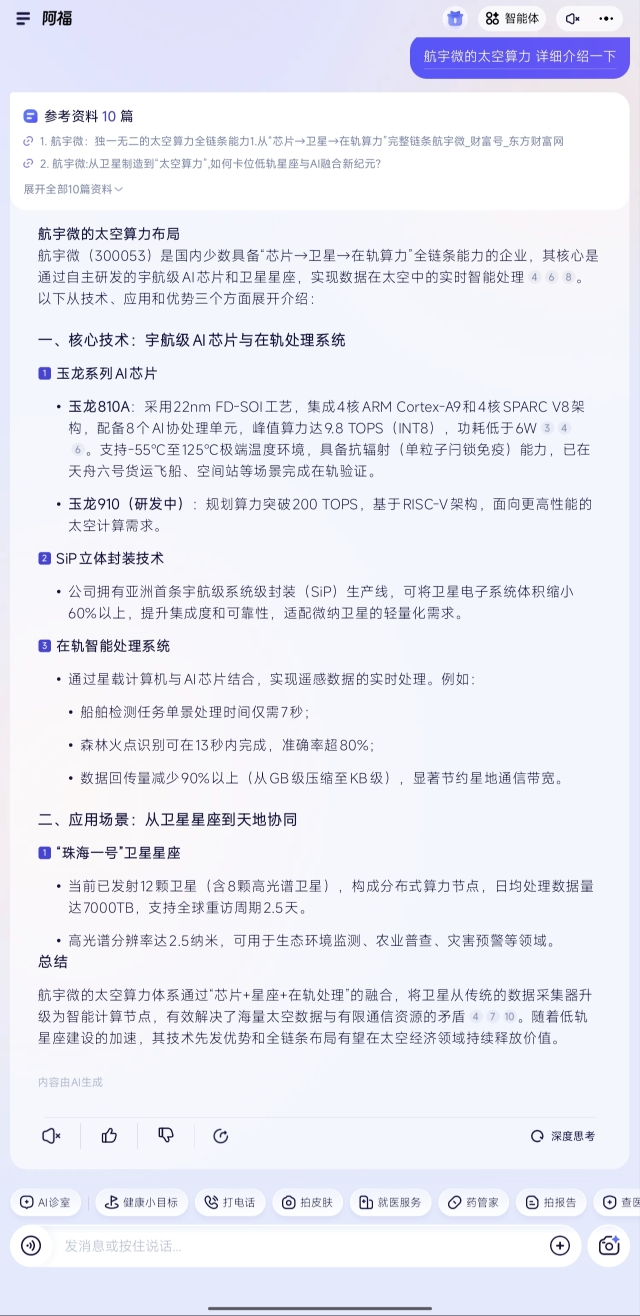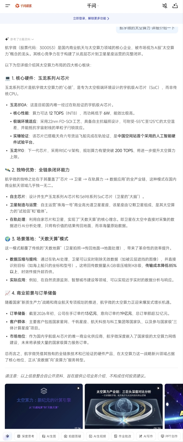 算力航宇微300053太空算力在手订单13亿意向订单16亿,中科院计算所采用“一星多卡”架构的算力核心-部署2026年下一代卫星组网计算星座,该架构通过单星搭载多枚航宇微300053玉龙810宇航AI芯片实现算力集群化,峰值算力达576 TOPS,玉龙810芯片展现出卓越的太空适应性——在-40℃至85℃极端温度环境下仍能稳定运行,辐射加固等级达SEL免疫,单芯片峰值算力720TOPS,能效比突破5TOPS/W,远超美国SpaceCube v3.0系统采用的传统DSP方案。单颗遥感卫星的应用服务收入可提升3-5倍,因为实时处理能力使其能提供高附加值的智能分析产品,而非简单的原始数据。订单来源:国家星网,千帆星座,航天科技,航天科工,国家河北卫星基地,国家算力基建-航宇微300053太空旅游飞行器建造商-芯片EDA存储芯片卫星芯片央国资-低位低价- 填补国内高性能抗辐照AI芯片空白,满足太空环境需求,打破国外垄断[3][4]。