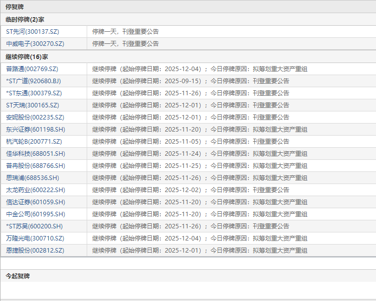 上证报中国证券网讯 12月5日,2家公司临停:ST先河、中威电子。