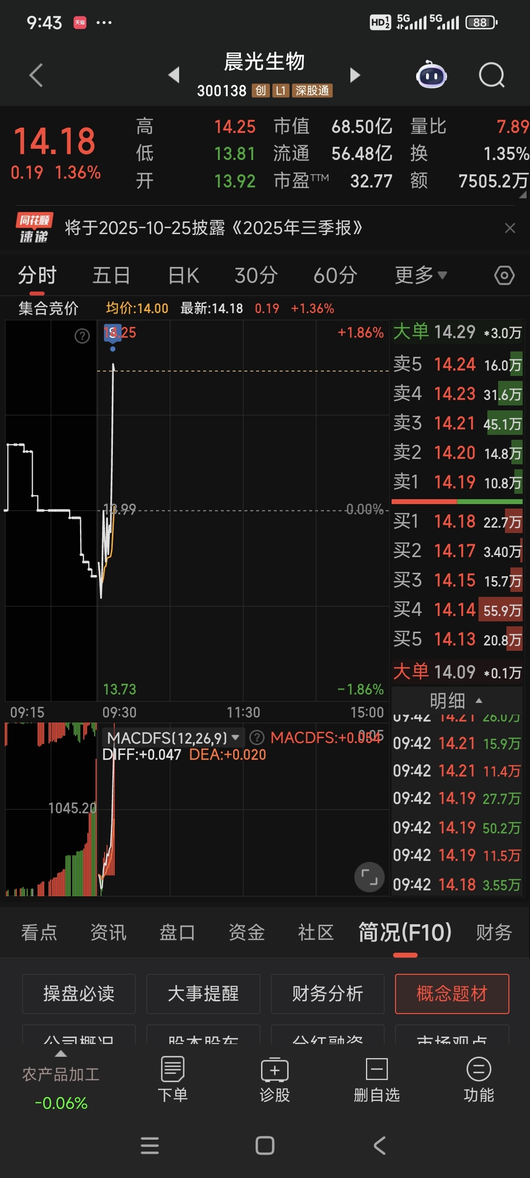 $晨光生物(SZ300138)$ 分时高点,拜拜啦