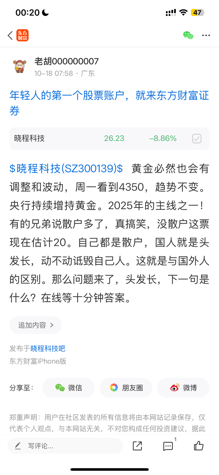 温馨提示: 1.根据《证券法》规定,禁止编造、传播虚假信息或者误导性信息,扰乱证券市场;2.用户在本社区发表的所有资料、言论等仅代表个人观点,与本网站立场无关,不对您构成任何投资建议。用户应基于自己的独立判断,自行决定证券投资并承担相应风险。《东方财富社区管理规定》