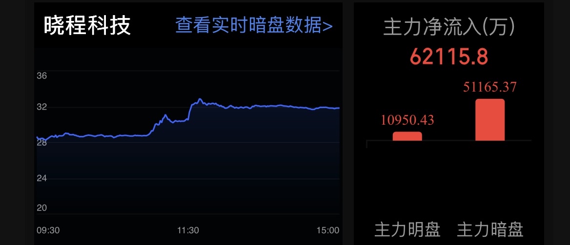 看主力资金盘口……今天明盘流入1个多亿,暗盘流入5个多亿,晓程科技起势了