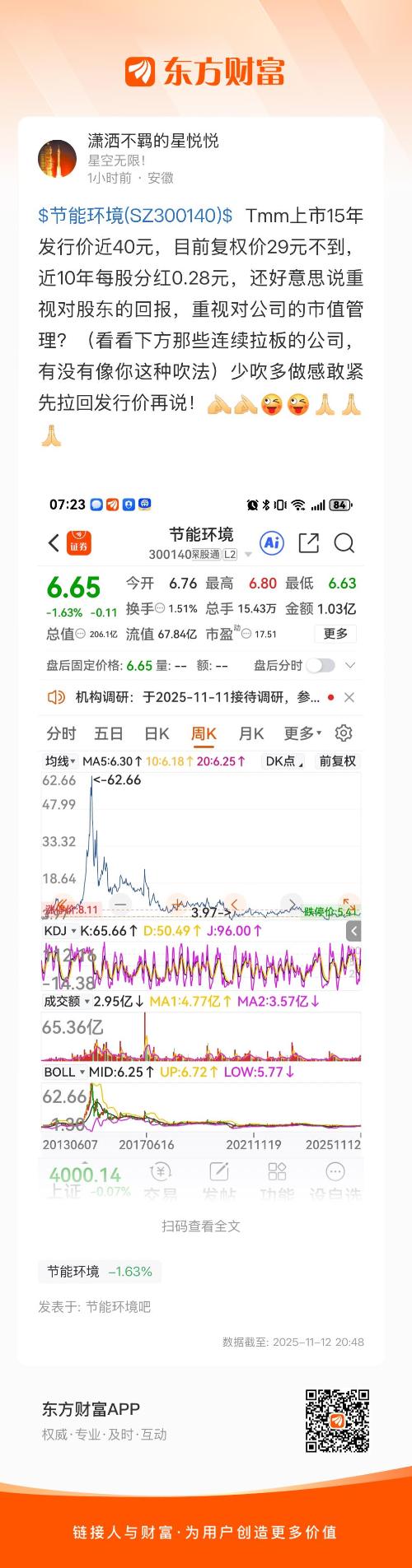 $节能环境(SZ300140)$ Tmm上市15年发行价近40元,目前复权价29元不到,近10年每股分红0.28元,还好意思说重视对股东的回报,重视对公司的市值管理?(看看下方那些连续拉板的公司,有没有像你这种吹法)少吹多做感敢紧先拉回发行价再说!
