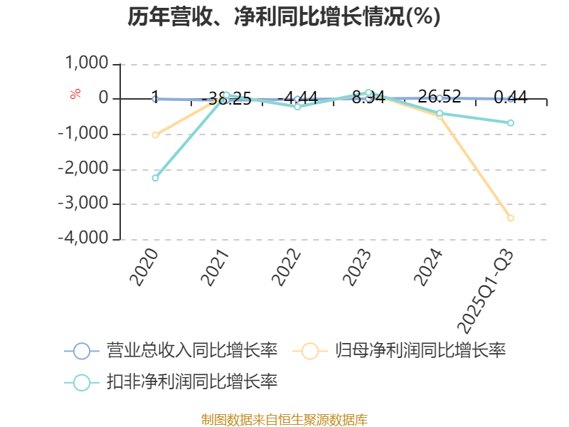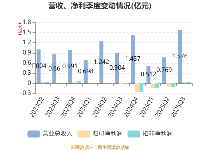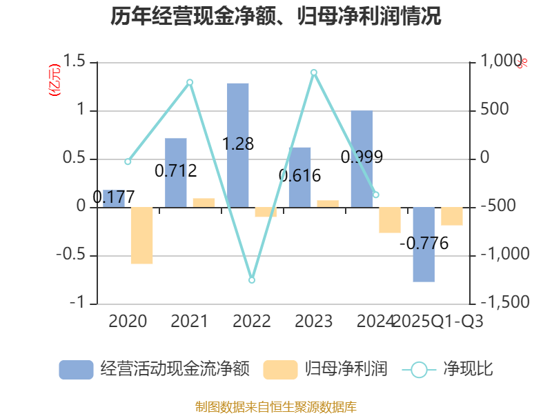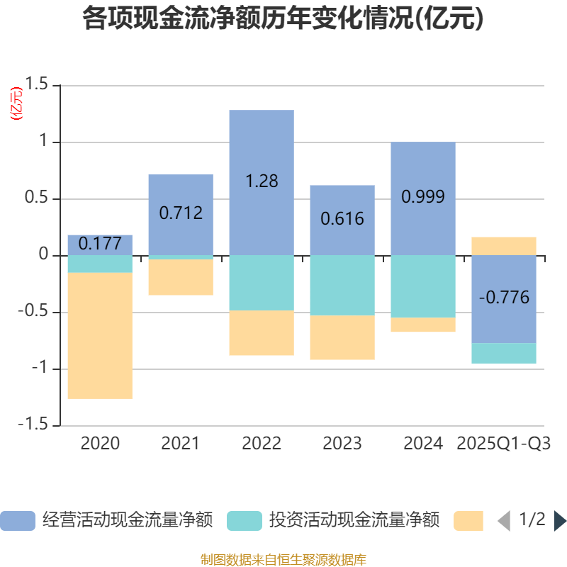 2025年前三季度,公司经营活动现金流净额为-7760.23万元,同比减少1.45亿元;筹资活动现金流净额1592.4万元,同比增加1262.54万元;投资活动现金流净额-1803.15万元,上年同期为-1282.7万元。
