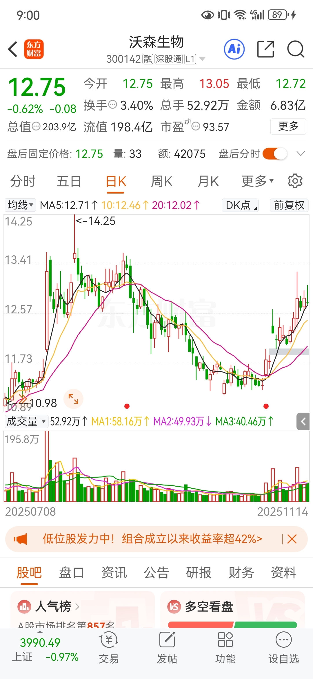$沃森生物(SZ300142)$ 我从来不马后炮,明天的走势高开至少2到5个点,近期观察低位洗盘,随时拉伸大阳线!