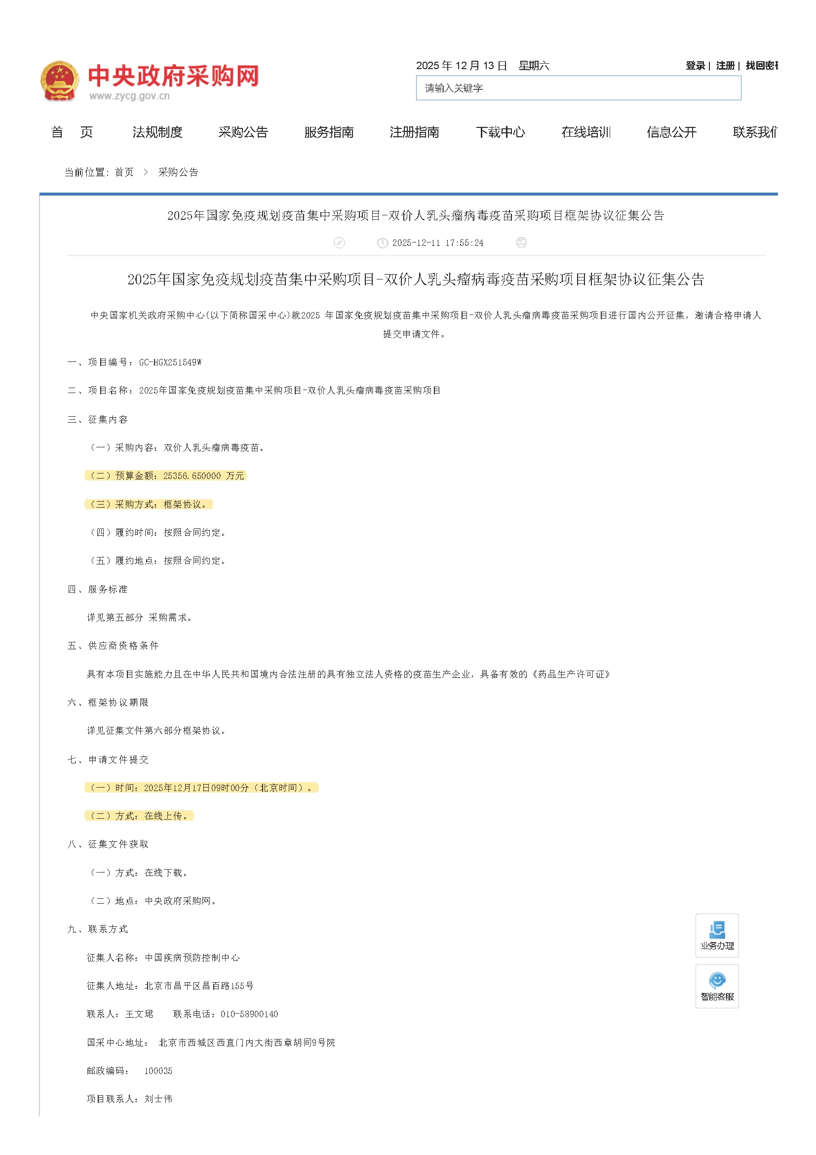 2025年国家免疫规划疫苗集中采购项目-双价人瘤病毒疫苗采购项目框架协议征集