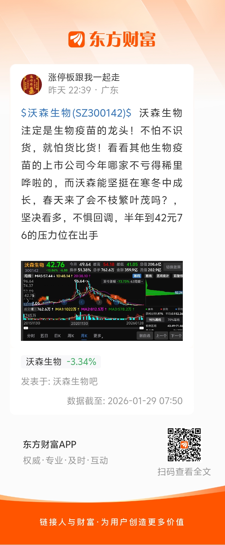 $沃森生物(SZ300142)$ 沃森生物注定是生物疫苗的龙头!不怕不识货,就怕货比货!看看其他生物疫苗的上市公司今年哪家不亏得稀里哗啦的,而沃森能坚挺在寒冬中成长,春天来了会不枝繁叶茂吗?,坚决看多,不惧回调,半年到42元76的压力位在出手