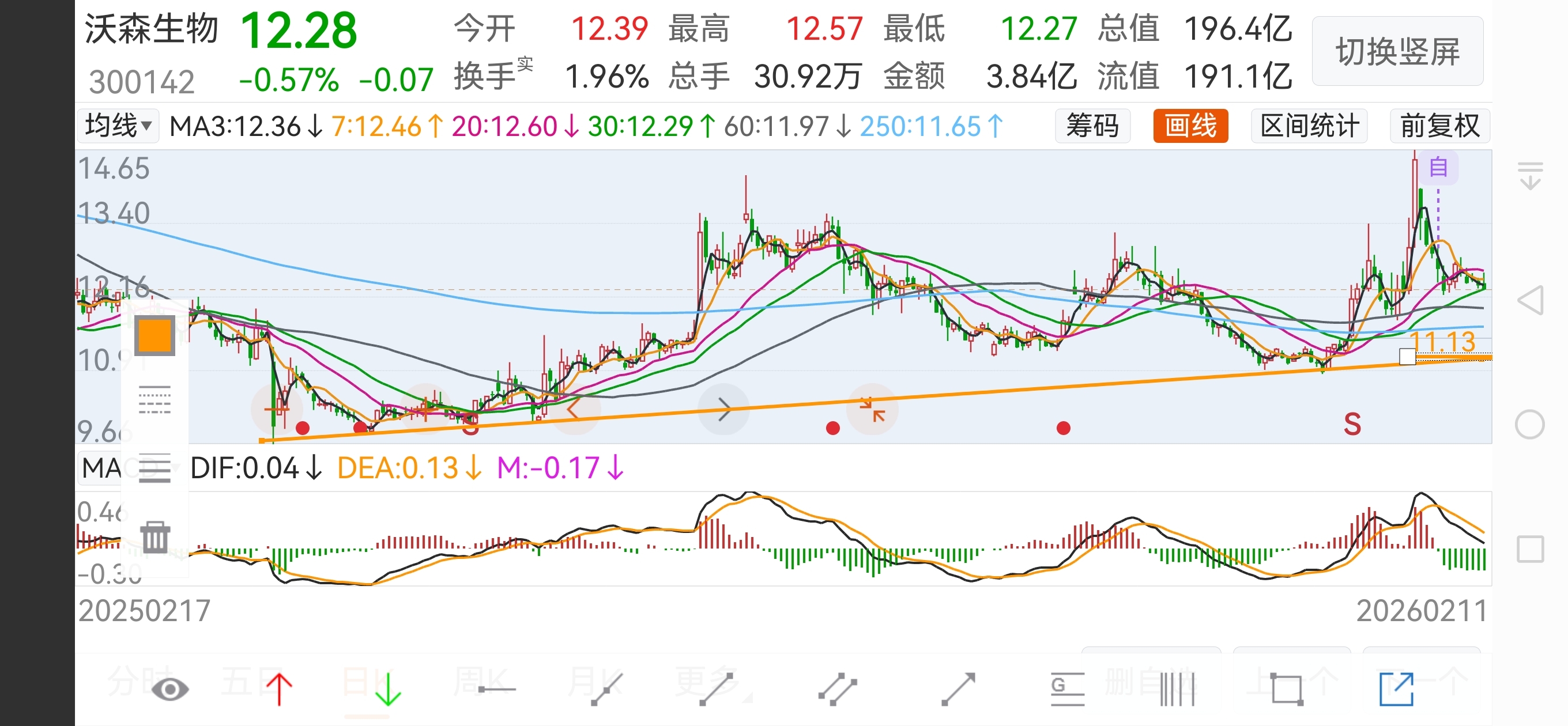$沃森生物(SZ300142)$ 至少要回到上升趋势线下轨11块附近,大盘调整的多的话,还要去破9.66