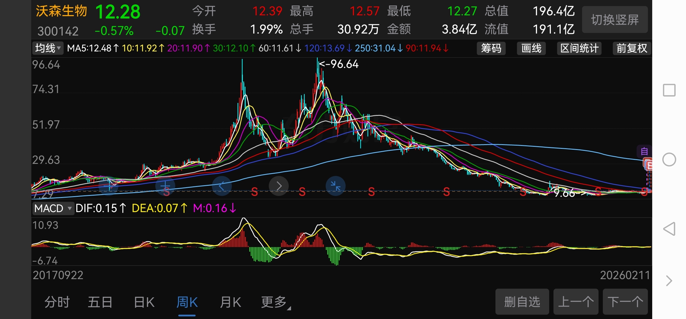 上一轮回是在本轮底部9块多洗盘转势,12块上方洗盘加速,30左右加速一路高歌至96.64。