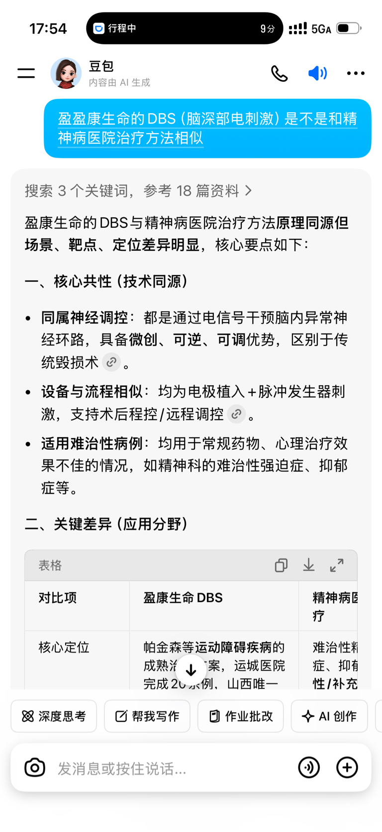 盈康生命的DBS与精神病医院治疗方法原理同源但场景、靶点、定位差异明显,核心要点如下: