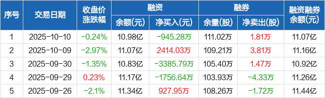 宋城演艺:融资净偿还945.28万元,融资余额10.98亿元(10-10)
