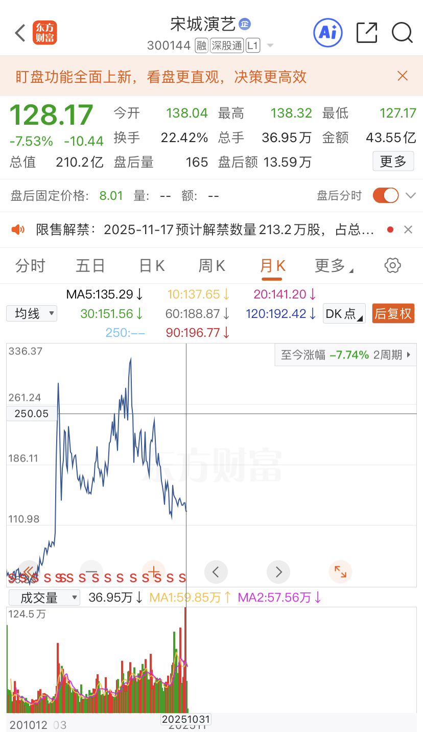 $宋城演艺(SZ300144)$ 8块钱的宋城演艺到底贵不贵?我们复权看看他现在的股价127块,但看这127块,试问黄董是不是很动心要减持呢?
