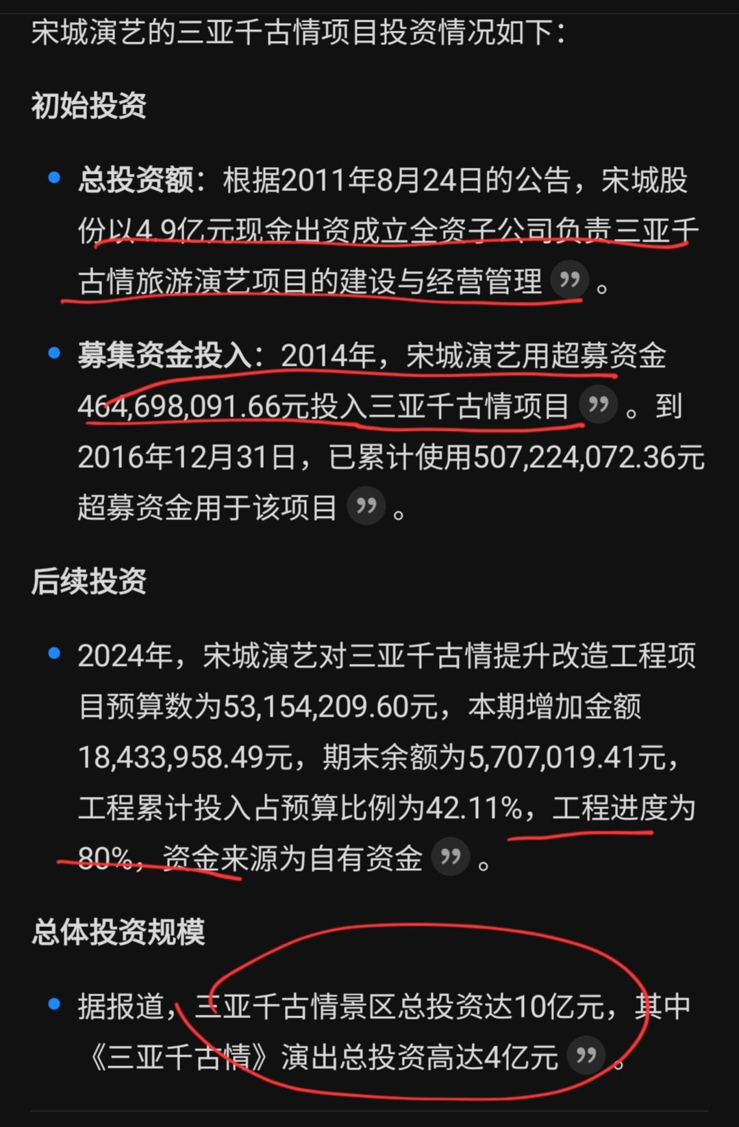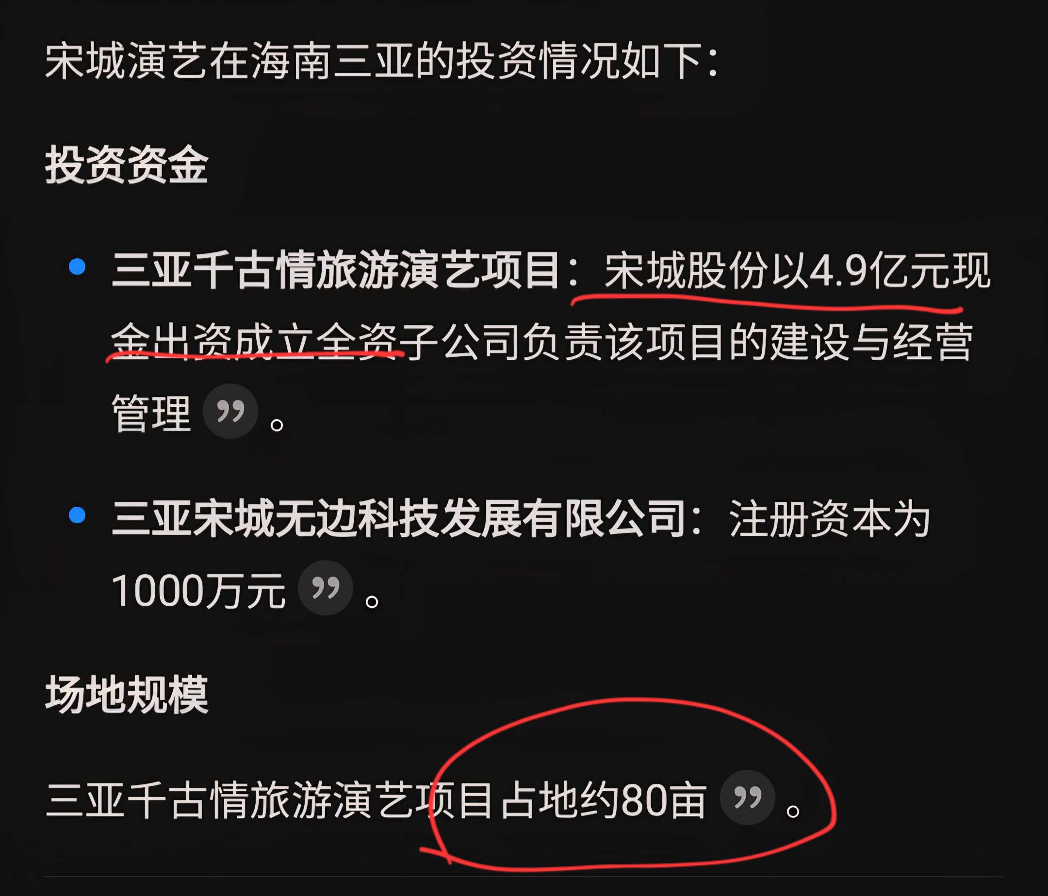 宋城演艺在三亚千古情是投资规模和金额最大的项目!一共总投资10亿元,目前投资了5
