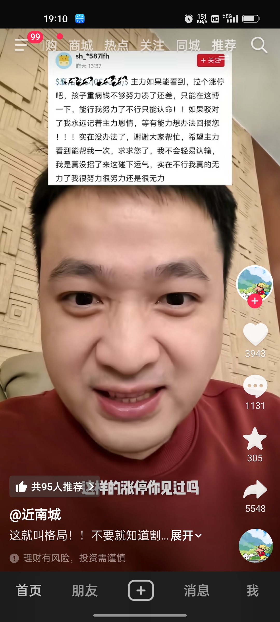 你们看看,不知道谁在抖音上发了个求助,然后说孩子重病,买了个股票,让主力拉涨停。