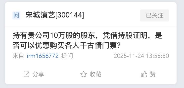 $宋城演艺(SZ300144)$ 宋垃圾,不能学一学峨眉山500股就免费,家人半价