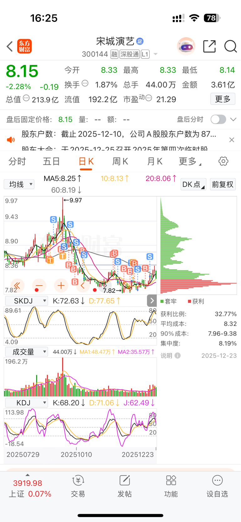 $宋城演艺(SZ300144)$ 看它会不会跌穿20日线,最好放量跌到7块5左右,不然不会向上冲,因为上方有套了几个月的筹码在呢。大家耐心等机会!反正我在这里赚了3W,现在空仓了。