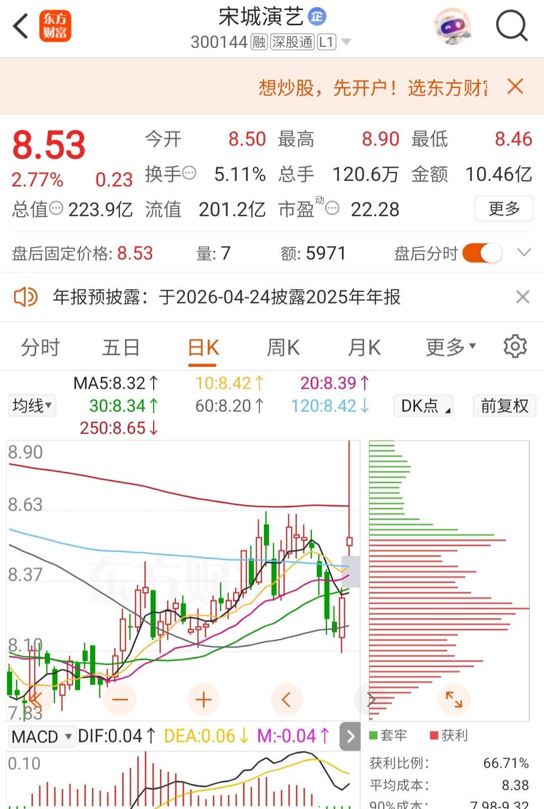 宋城演艺周五的放量拉升之时留下长长的上影线!按照前三次放量拉升是主力出货而大量投资人的接盘的状态!这次是否又是主力出货呢?也许这次不同,主力资金仓位极低,投资人学乖乖了,肯定是以抛为主,等待下周跌下来再买回来!所以这次也许是主力接盘,散户抛筹码,但需要下周来验证!下周如果不回补缺口,再次上攻并站稳9元以上区域!那春节前的一波上涨行情正式开始!