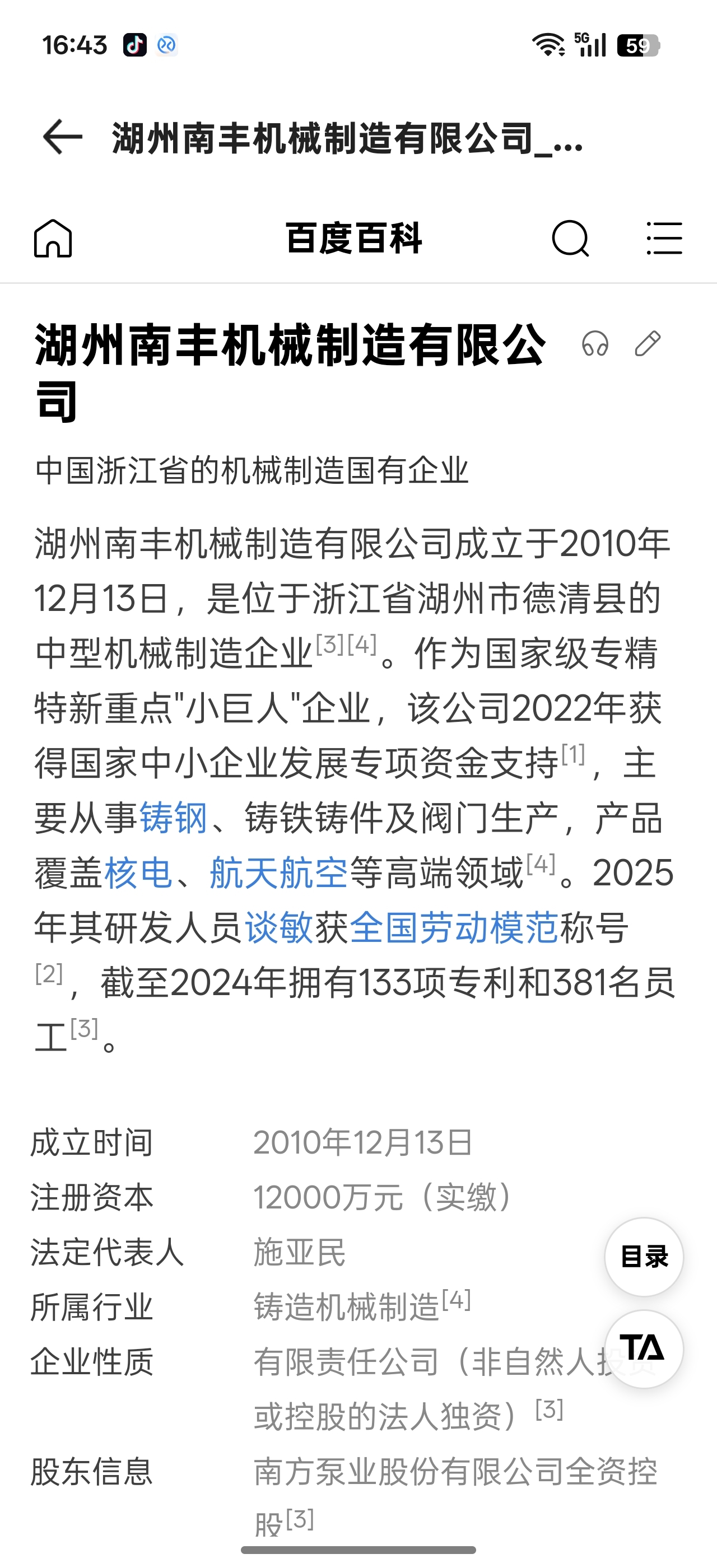 $南方泵业(SZ300145)$ 湖州南丰机械为南方泵业子公司,产品覆盖核电、航空航天等高端领域。。