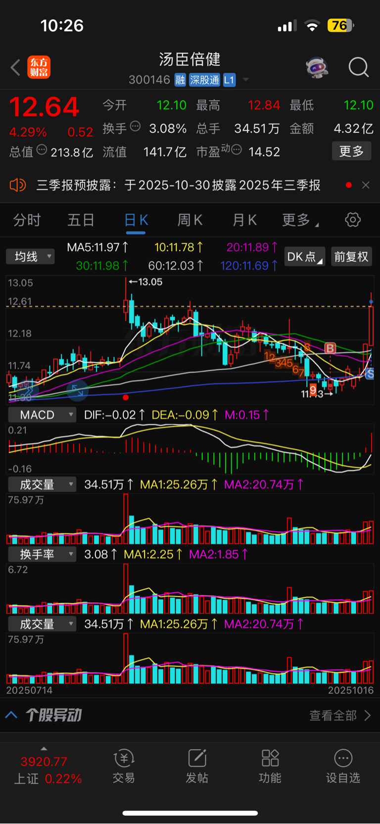 $汤臣倍健(SZ300146)$ 搞了十个点撤了