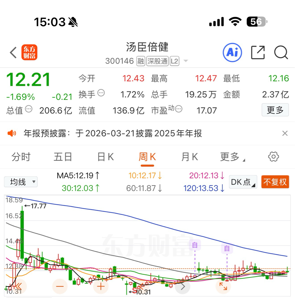 $汤臣倍健(SZ300146)$ 今晚说不不定有公告,周线蓄势待发