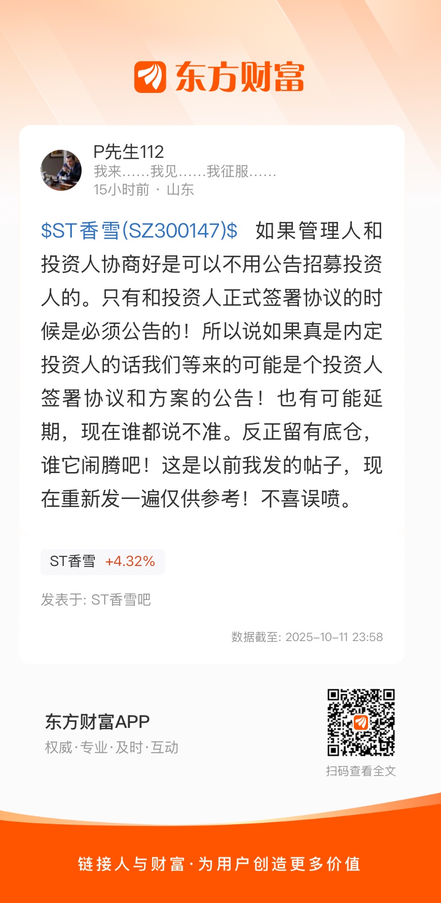 $ST香雪(SZ300147)$ 如果管理人和投资人协商好是可以不用公告招募投资人的。只有和投资人正式签署协议的时候是必须公告的!所以说如果真是内定投资人的话我们等来的可能是个投资人签署协议和方案的公告!也有可能延期,现在谁都说不准。反正留有底仓,谁它闹腾吧!这是以前我发的帖子,现在重新发一遍仅供参考!不喜误喷。
