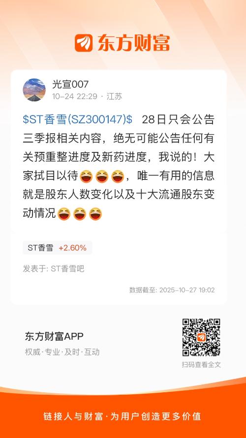 $ST香雪(SZ300147)$ 28日只会公告三季报相关内容,绝无可能公告任何有关预重整进度及新药进度,我说的!大家拭目以待