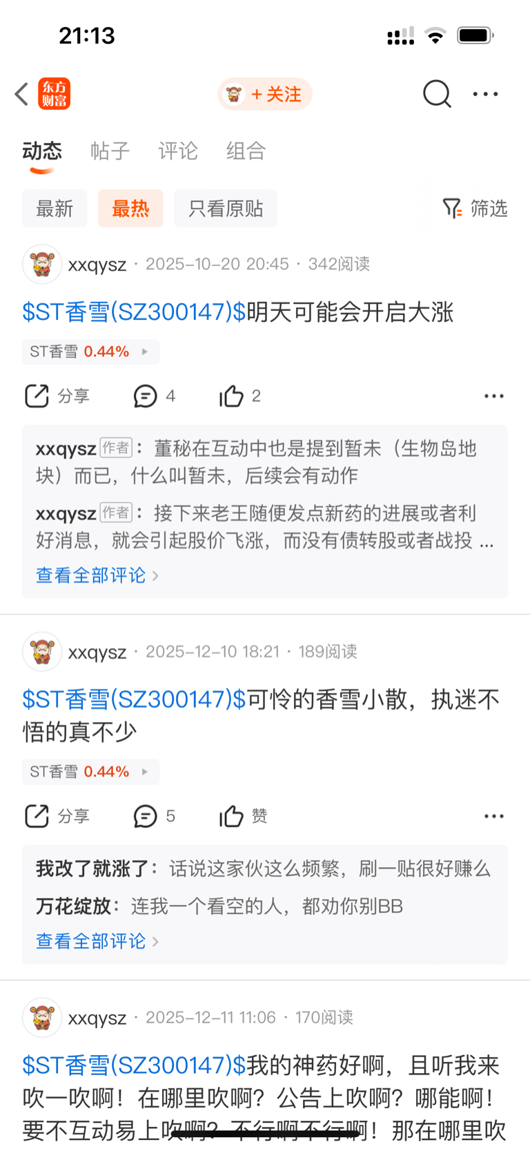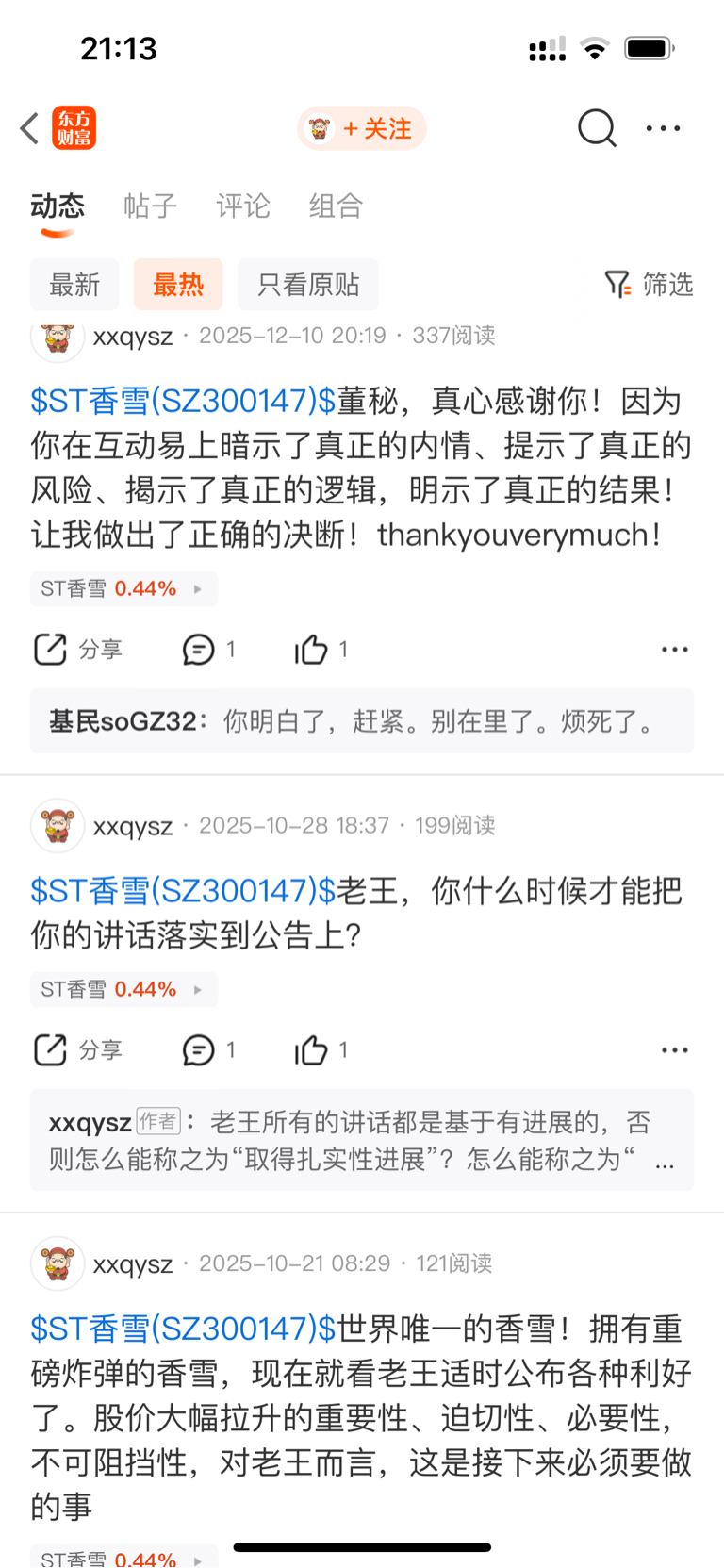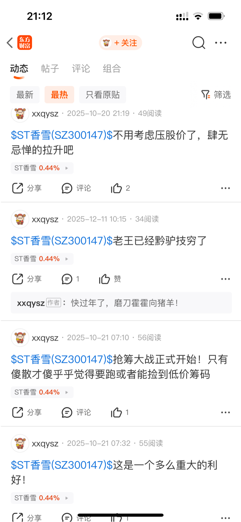 看看这位常客10月份和12月份在香雪股吧的帖子,两种截然不同的态度,你品,你细品