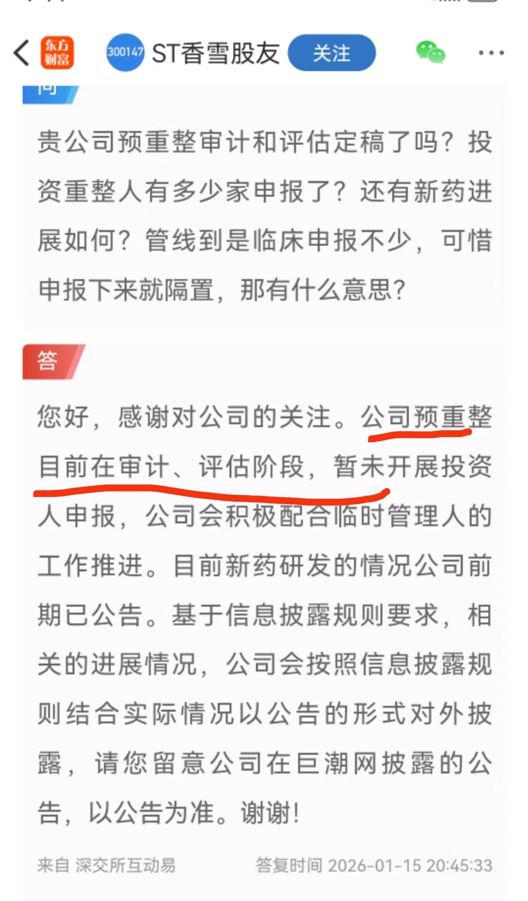 $ST香雪(SZ300147)$ 看信息要准确理解文意!董秘说还在审计评估阶段,但是没有否认审计评估已经进入结尾阶段。